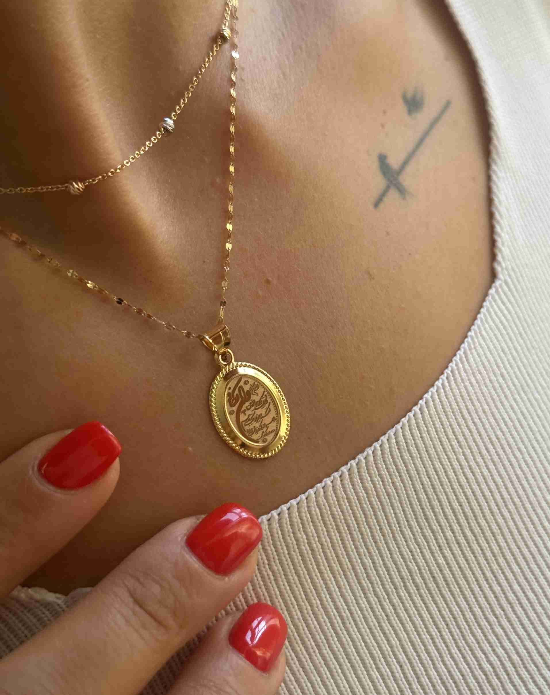 پلاک طلا طرح بیضی با حکاکی و ان یکاد در یک روی آن و چهار قل در روی دیگر، نمادی از معنویت و حفاظت در تمامی لحظات است و با طراحی ظریف و دقیقی که دارد می تواند هدیه ای معنوی و خاص برای کودکان، چشم روشنی برای نوزادان و یا حتی استفاده روزمره باشد، که می توانید با زنجیرهای مختلف ست کنید. این پلاک زیبا، از طلای با کیفیت ساخته شده و با فرم بیضی و کلاسیک خود، جلوه ای زیبا و ارزشمند دارد.