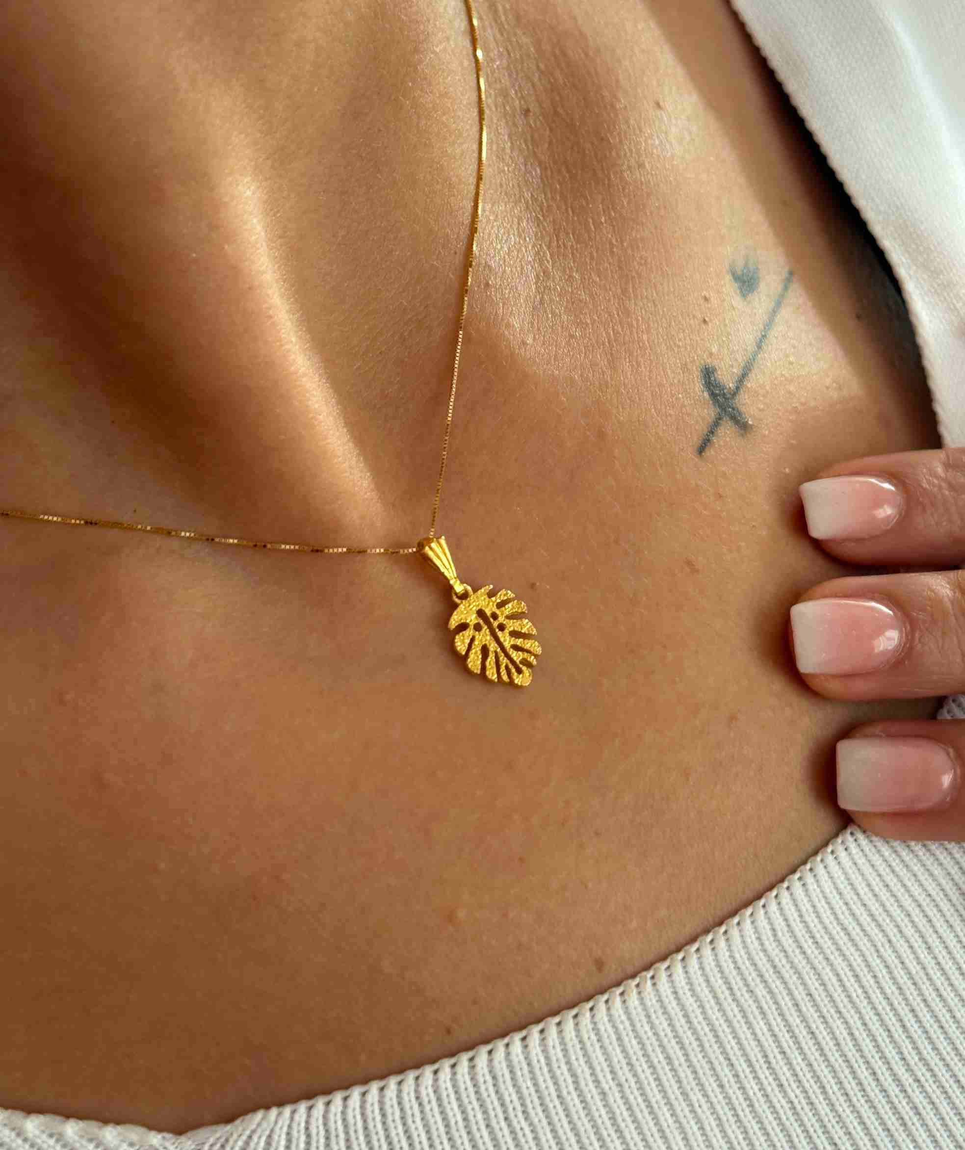 پلاک طلای به شکل برگ انجیری با طراحی سه بعدی، جلوه ای طبیعی و چشم نواز دارد. سطح این پلاک بافتی ظریف و مات دارد که حس طبیعی بودن برگ را به خوبی القا می کند. شیارهای طراحی شده بر روی آن، به همراه فرم برجسته و خمیدگی های نرم، باعث شده اند که این اثر هنری زیبا جلوه ای واقعی و زنده داشته باشد.