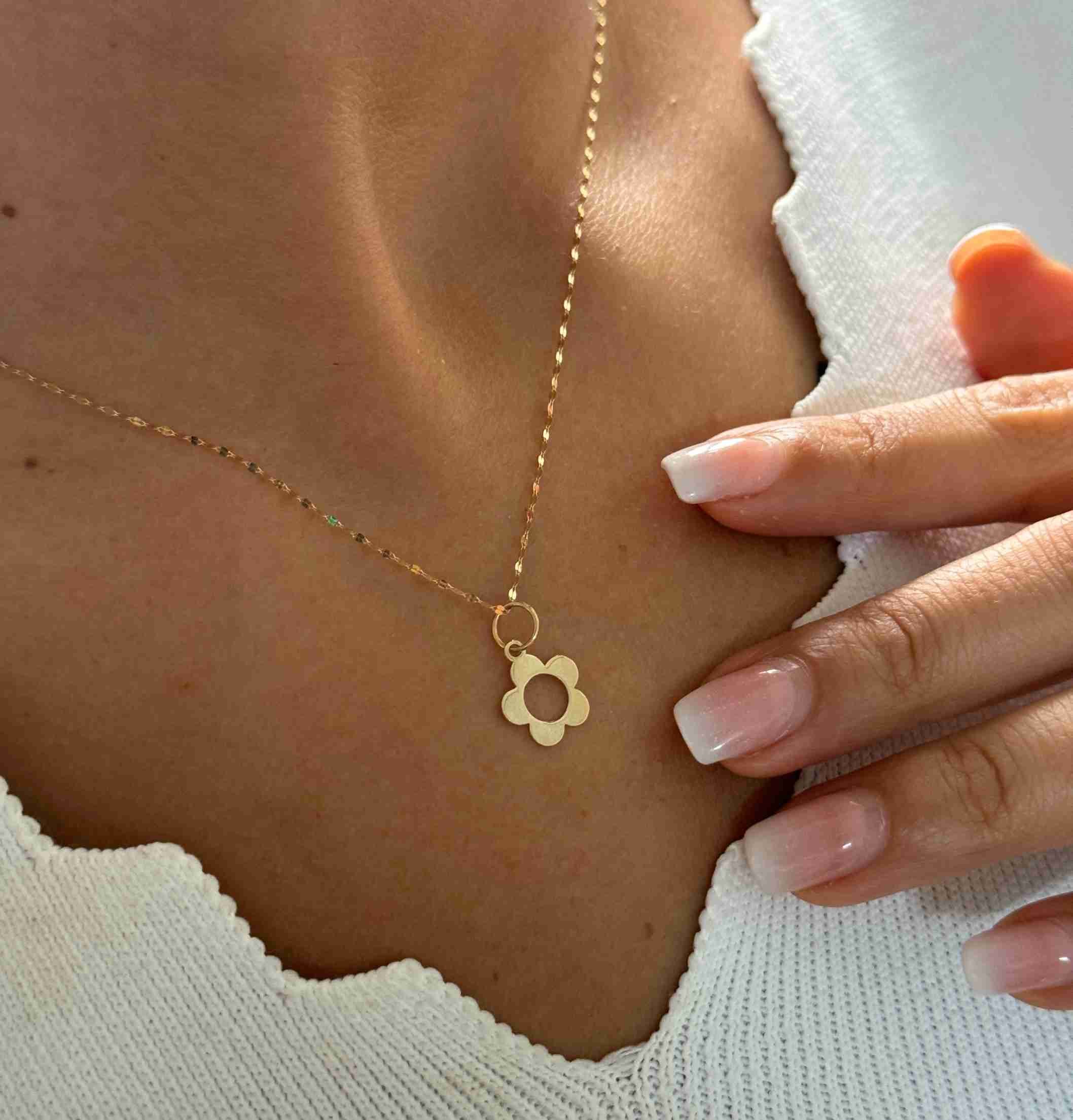 پلاک طلای لیزری به شکل گل پنج پر با طراحی ظریف و متقارن که در مرکز آن یک دایره تو خالی قرار گرفته است. این طرح زیبا و مینیمال با ترکیب هنرمندانه ای از فرم های طبیعی و هندسی، جلوه ای خاص و چشم نواز دارد. ساختار سبک و لطیف این اثر هنری زیبا، آن را به گزینه ای مناسب برای استفاده روزمره یا هدیه ای خاص تبدیل کرده است. طراحی گل با پنج گلبرگ متوازن، نمایی ظریف و شیک ایجاد کرده که می تواند به تنهایی یا در ترکیب با دیگر زیورآلات جلوه ای منحصر به فرد به استایل شما ببخشد. حتی می تواند هدیه ای بی نظیر و ارزشمند به شمار آید.