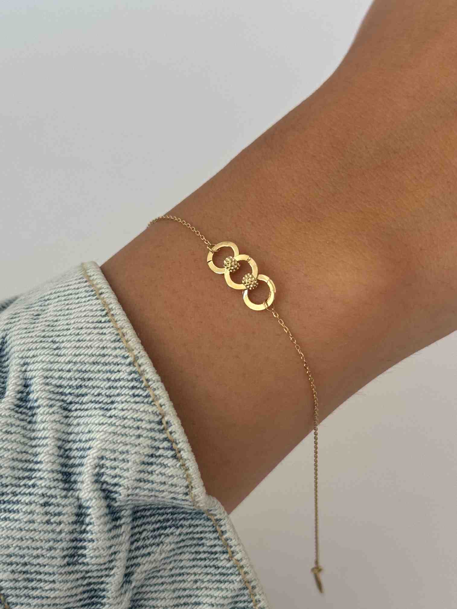 این دستبند طلا با طراحی ساده، ظریف و در عین حال مفهومی، از یک زنجیر کلاسیک و درخشان ساخته شده که در مرکز آن سه حلقه طلایی بهصورت درهم تنیده قرار گرفتهاند.