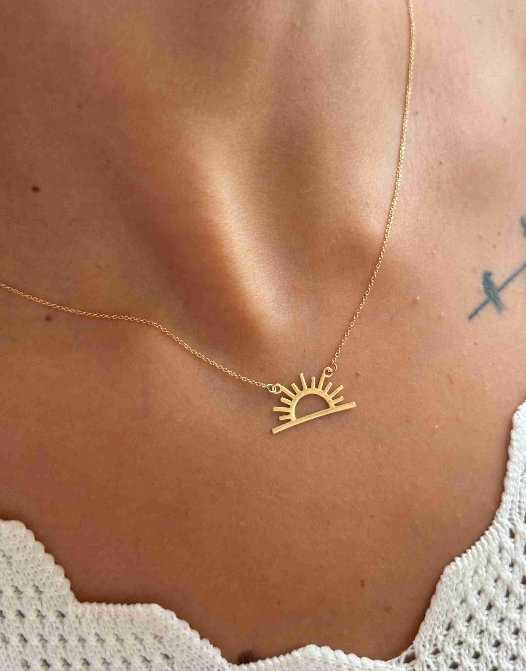 گردنبند طلا با زنجیر متصل و طراحی مینیمال طلوع خورشید، نمادی از امید و آغازهای تازه. این مدل به صورت خطی طراحی شده و پرتوهای خورشید نیز با خطوطی ظریف و هماهنگ اجرا شده اند که جلوه ای مدرن و در عین حال لطیف به آن بخشیده است. ساخته شده از طلای با کیفیت، این گردن بند با طراحی سبک و ظریف خود، انتخابی مناسب برای استفاده روزمره و استایل های مینیمال محسوب می شود. ترکیب سادگی و مفهوم عمیق طلوع، این مدل را به گزینه ای خاص و متمایز برای کسانی تبدیل کرده که به زیورآلات نمادین و احساسی علاقه دارند.