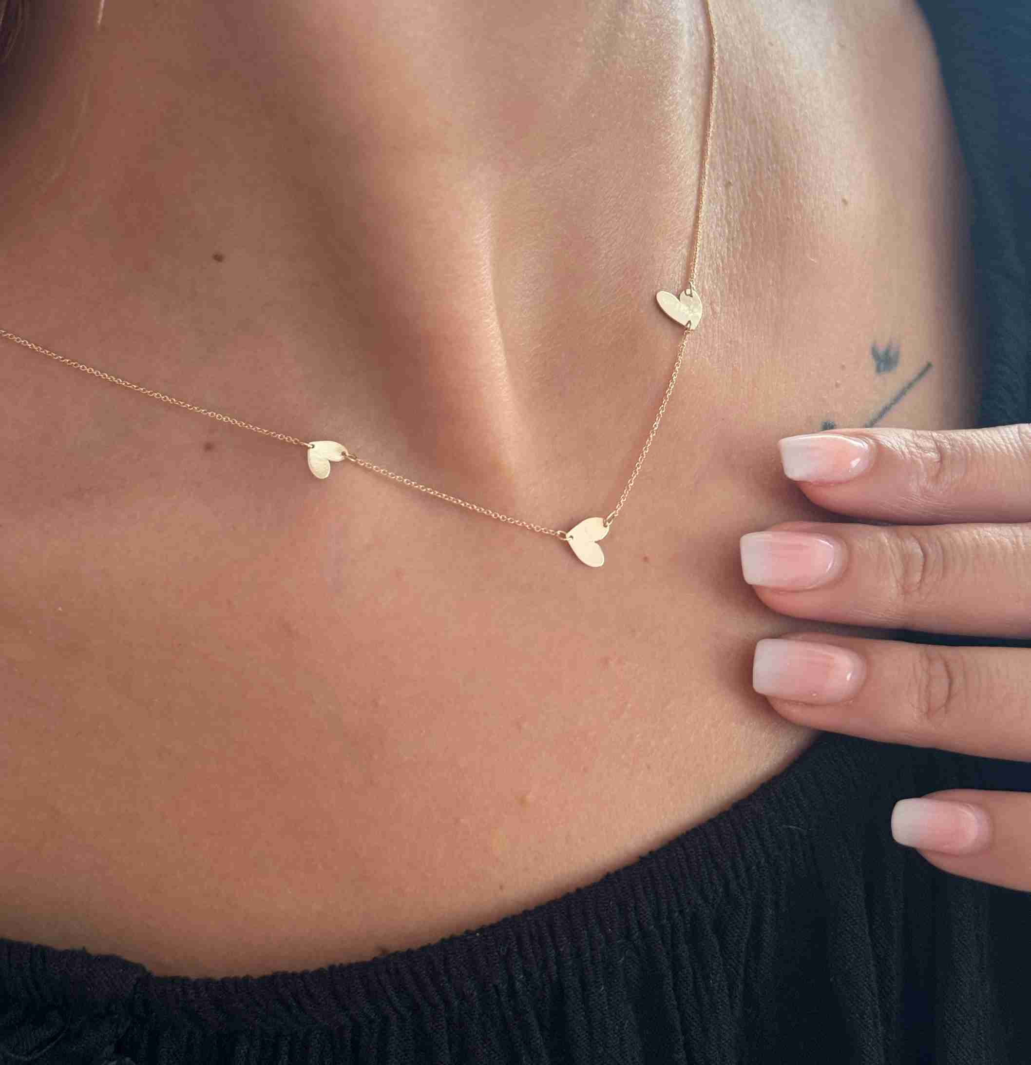 گردنبند طلا با زنجیر متصل و طراحی سه قلب در سه سایز بزرگ، متوسط و کوچک، که به صورت مرتب و هماهنگ پشت سر هم و روی زنجیر قرار گرفته اند، جلوه ای لطیف و دخترانه دارد. این ترکیب زیبا، نمادی از عشق و احساسات عمیق است و با طراحی ساده اما چشم نواز خود، به استایل شما جلوه ای خاص و رمانتیک می بخشد. ساخته شده از طلای با کیفیت، این گردن بند با فرم سبک و ظریف خود، انتخابی ایده آل برای استفاده روزمره و یا هدیه ای خاص محسوب می شود. طراحی سه قلب پیوسته، این مدل را به گزینه ای منحصر به فرد برای کسانی تبدیل کرده که به زیورآلات فانتزی و احساسی علاقه دارند.