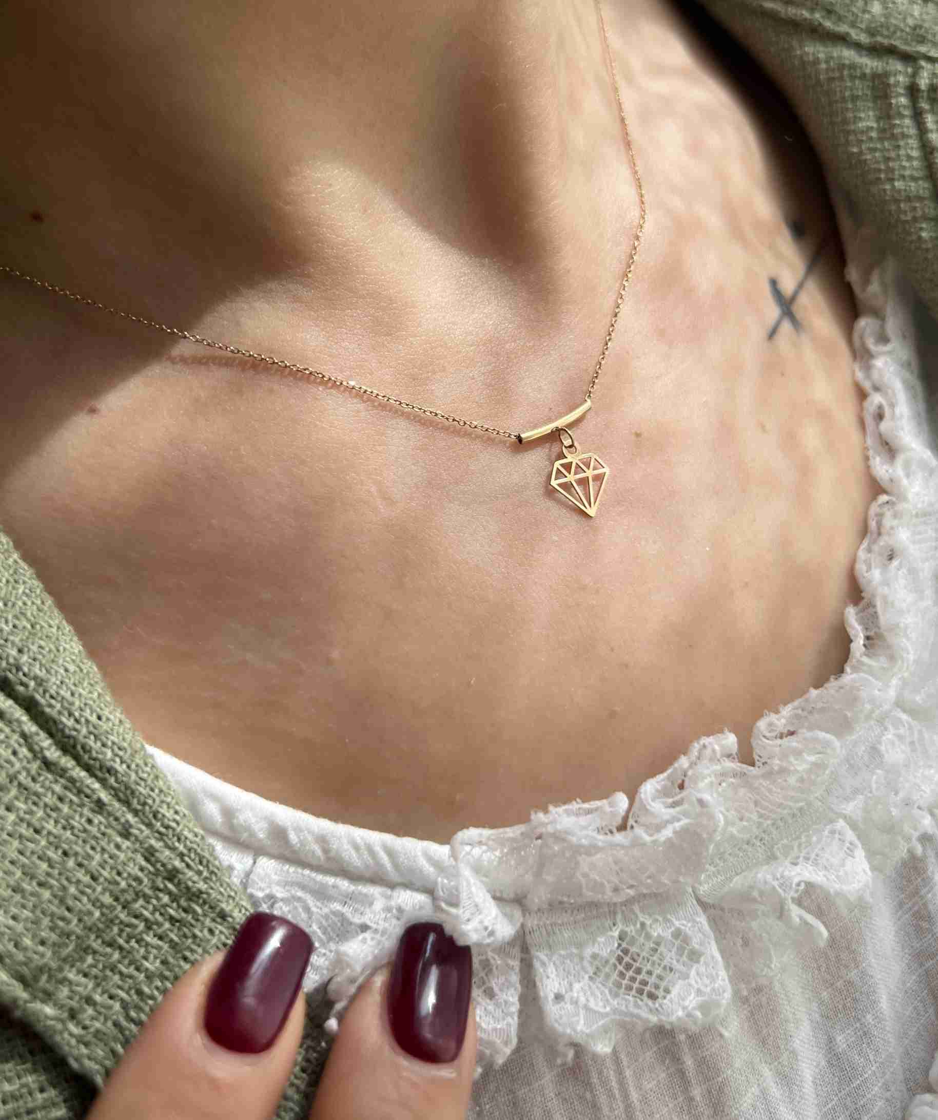 گردنبند طلا زنجیر متصل با طراحی الماس خطی، مدلی ظریف و درخشان که جلوه ای مینیمال و مدرن دارد. در این طرح، الماس به صورت خطی، بر روی مفتولی ظریف و هلالی شکل بصورت یکپارچه بر روی زنجیر سوار شده است. که زیبایی گردن بند را دو چندان کرده است.