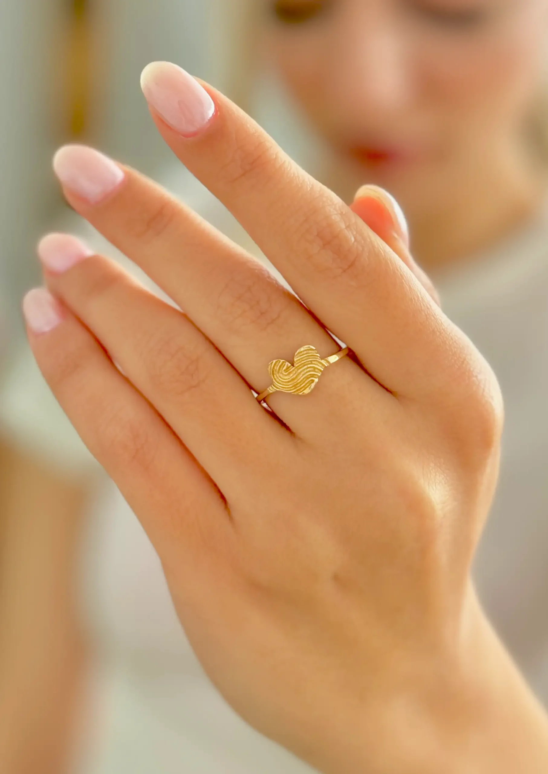 این انگشتر زیبا و منحصربهفرد از طلای ۱۸ عیار ساخته شده و طراحی آن ترکیبی از عشق و هویت شخصی را در قالبی هنری به نمایش میگذارد. در مرکز حلقه، یک قلب برجسته که کمی حالت مات دارد قرار گرفته و سطح آن با بافت ظریف شبیه به اثر انگشت طراحی شده است؛ طرحی که حس خاص و یکتابودن عشق را تداعی میکند.
