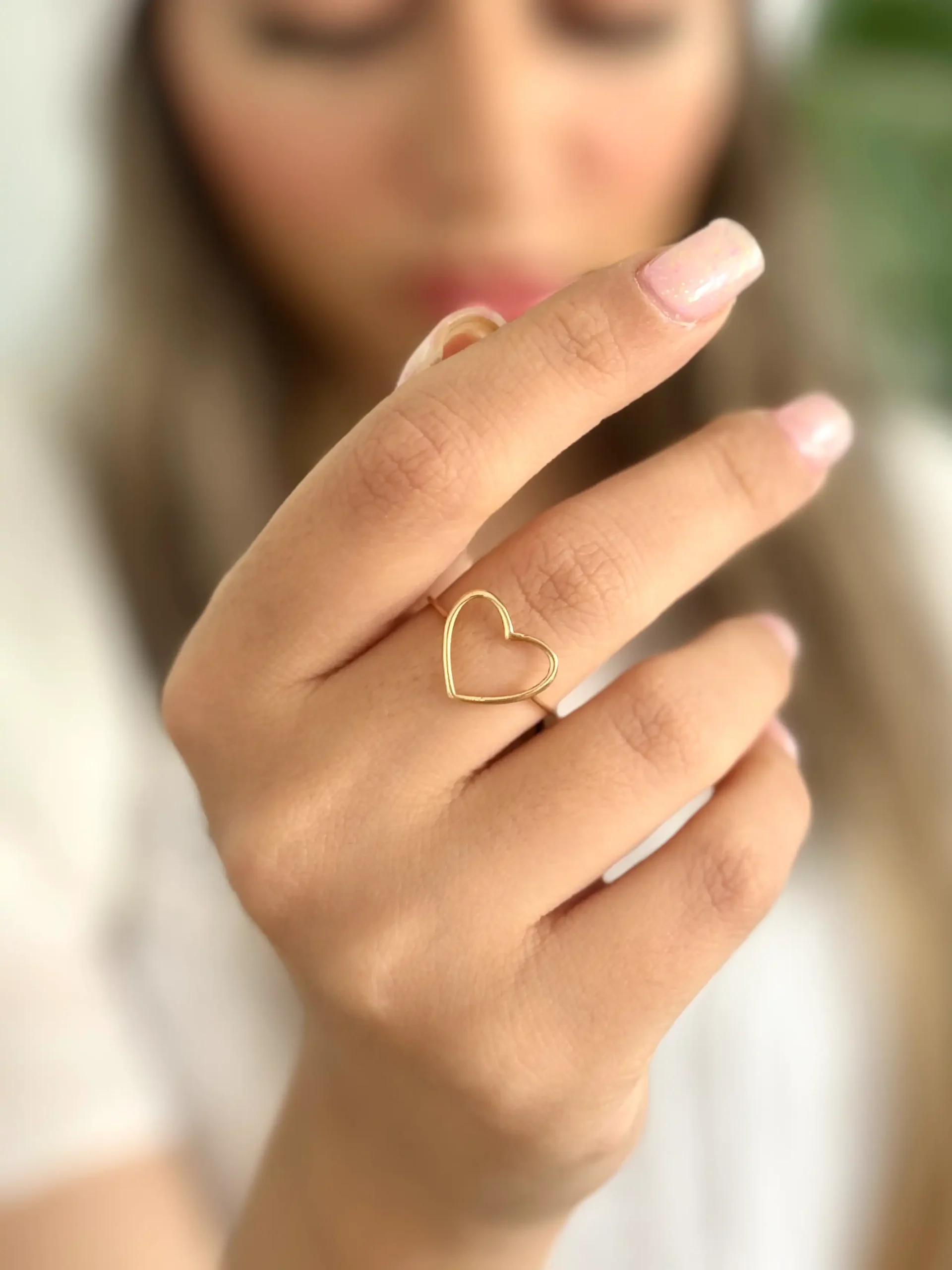 در مرکز حلقه، یک قلب بزرگ خطی و توخالی قرار گرفته که بهصورت یکپارچه به بدنهی حلقه متصل شده و بدون نگین یا تزئینات اضافی، با زیبایی خالص طلای براق خود خودنمایی میکند.