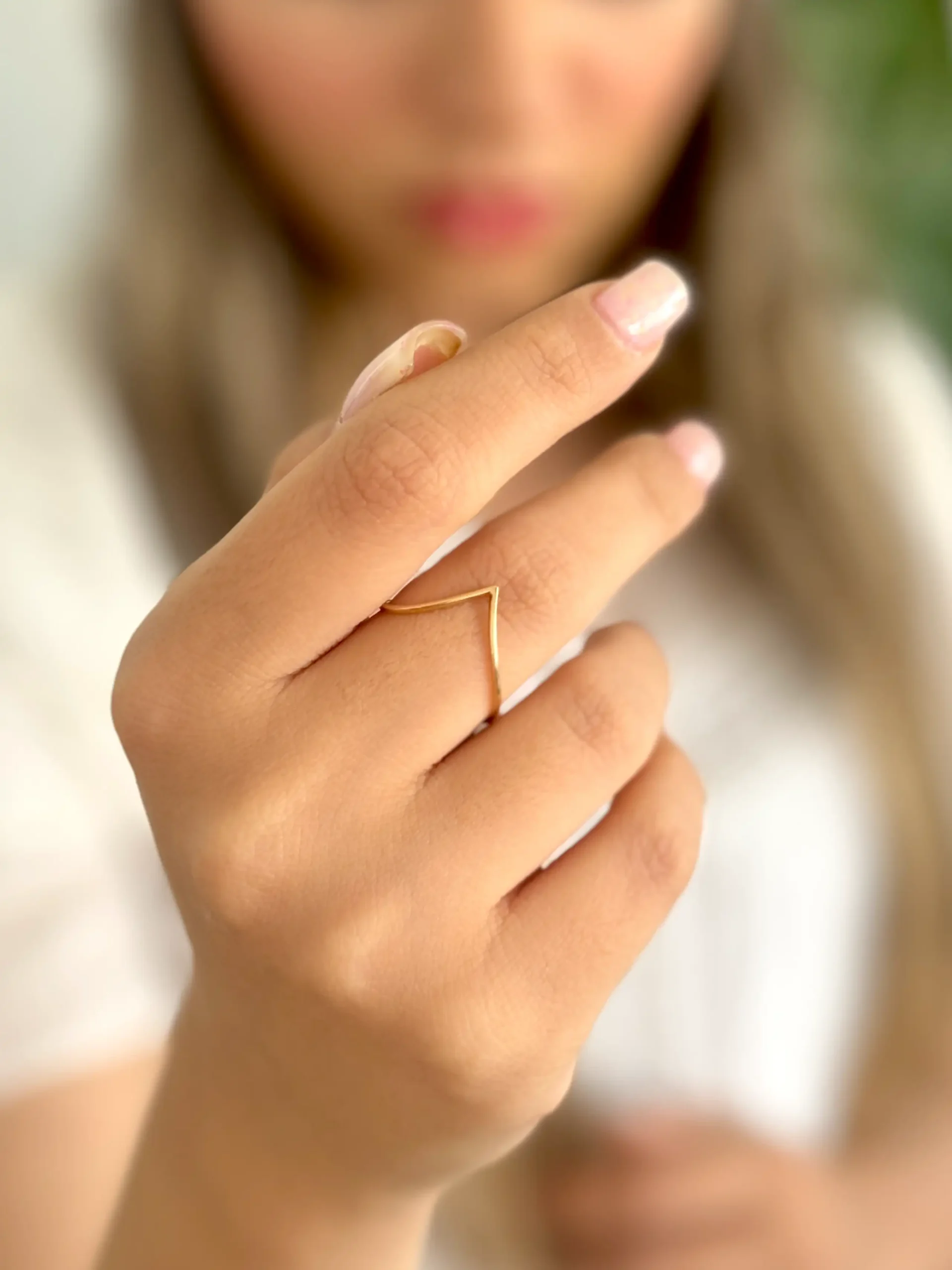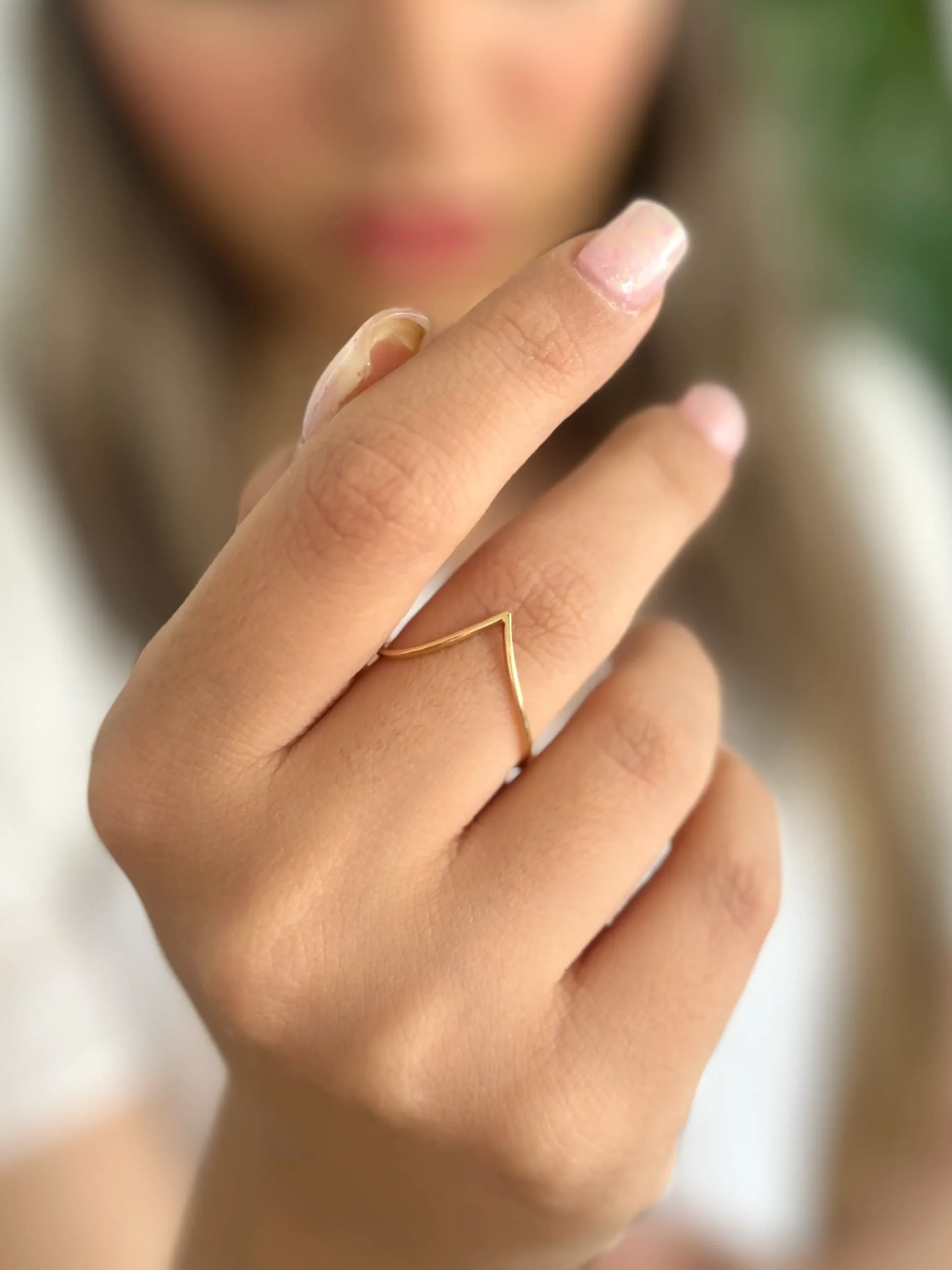 خطوط این حلقه، صاف، ظریف و نرم هستند و خم V مانند آن، حالتی از سادگی و در عین حال جسارت را القا میکند. قسمت پایین V در مرکز انگشت قرار میگیرد و دو بازوی آن به سمت بالا کشیده میشوند، که باعث کشیدهتر دیده شدن انگشتان و زیبایی بیشتر دستان میشود.