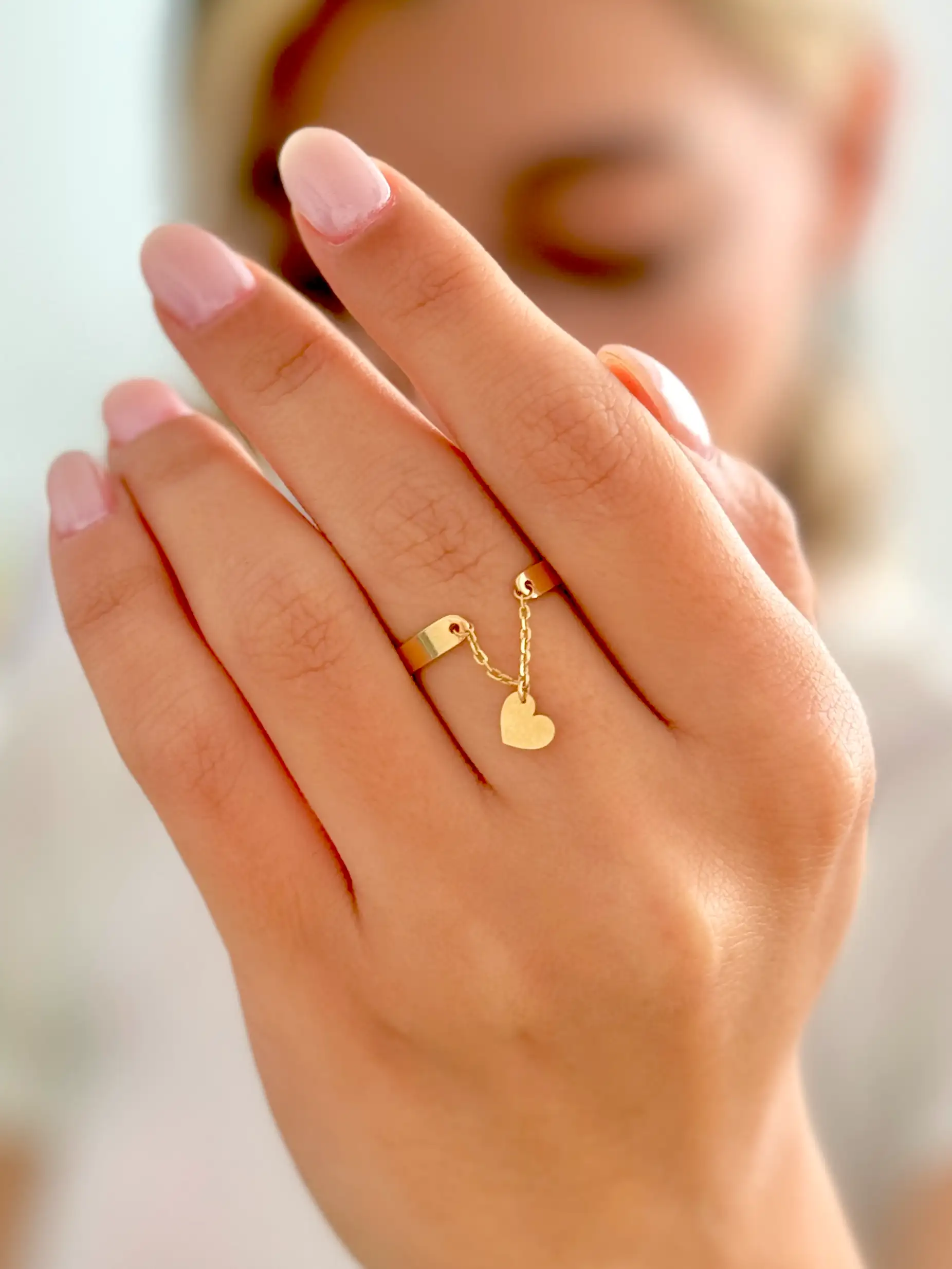در مرکز حلقه، یک زنجیر ظریف و طلایی قرار دارد که به زیبایی در وسط حلقه خودنمایی میکند. از این زنجیر، یک قلب کوچک و صیقلی آویز شده که با هر حرکت دست، درخشش خود را نشان میدهد و حس لطافت و عشق را تکمیل میکند.