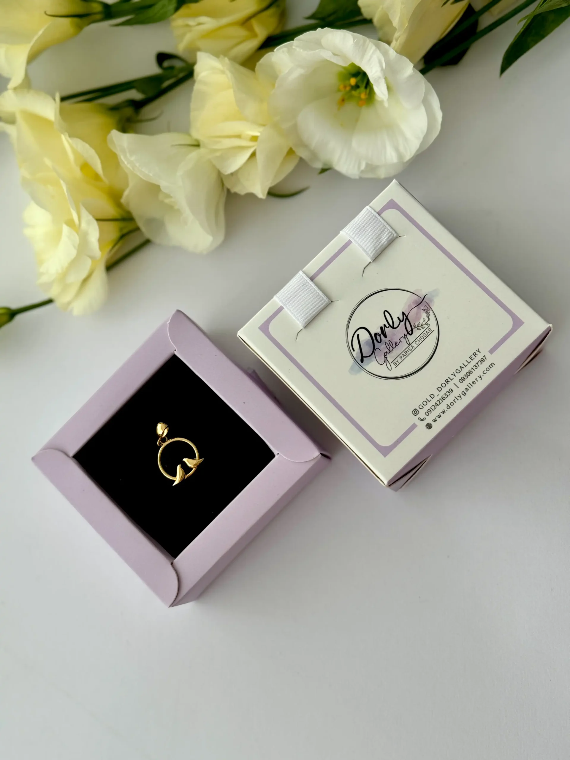 این آویز طلا با طراحی دایرهای توخالی و خطی، ترکیبی زیبا و نمادین از طبیعت و عشق را به تصویر میکشد. فرم کلی به شکل یک دایره ساده و مینیمال طراحی شده که نماد پیوستگی، زندگی و چرخه طبیعت است. در بخش پایینی این دایره، دو پرنده طلایی توپر با ساختار ریختهگری شده، روبروی یکدیگر قرار گرفتهاند.