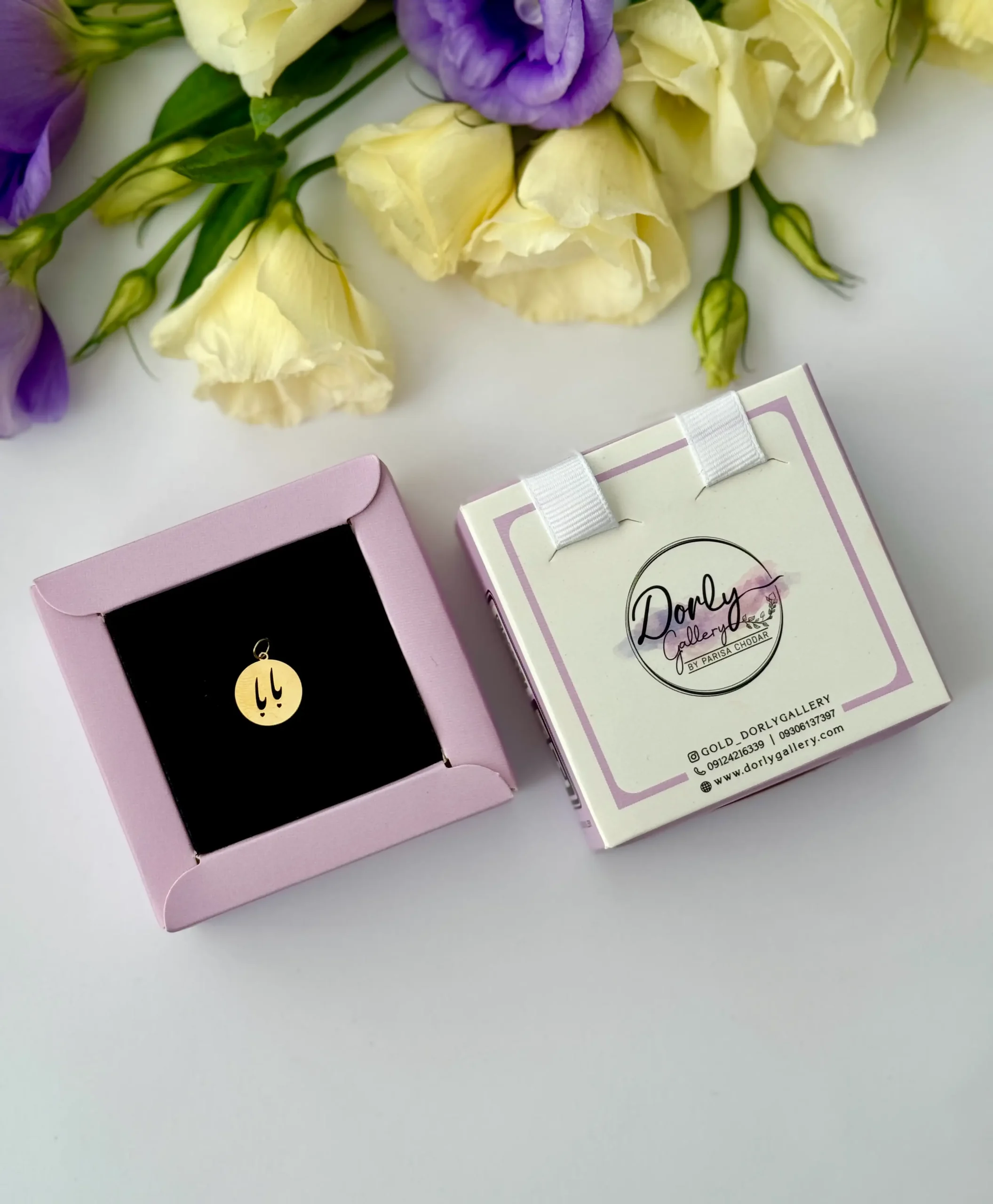 این آویز زیبا از طلای ۱۸ عیار ساخته شده و طراحی آن بهصورت لیزری دقیق انجام شده است. در مرکز دایرهای طلایی، براق و صیقلی، کلمه «بابا» به صورت توخالی برش خورده است. نکته جذاب و احساسی این مدل، جایگزینی نقطههای «بابا» با دو قلب ظریف و کوچک توخالی است که جلوهای عاشقانه و خاص به آویز میدهد.