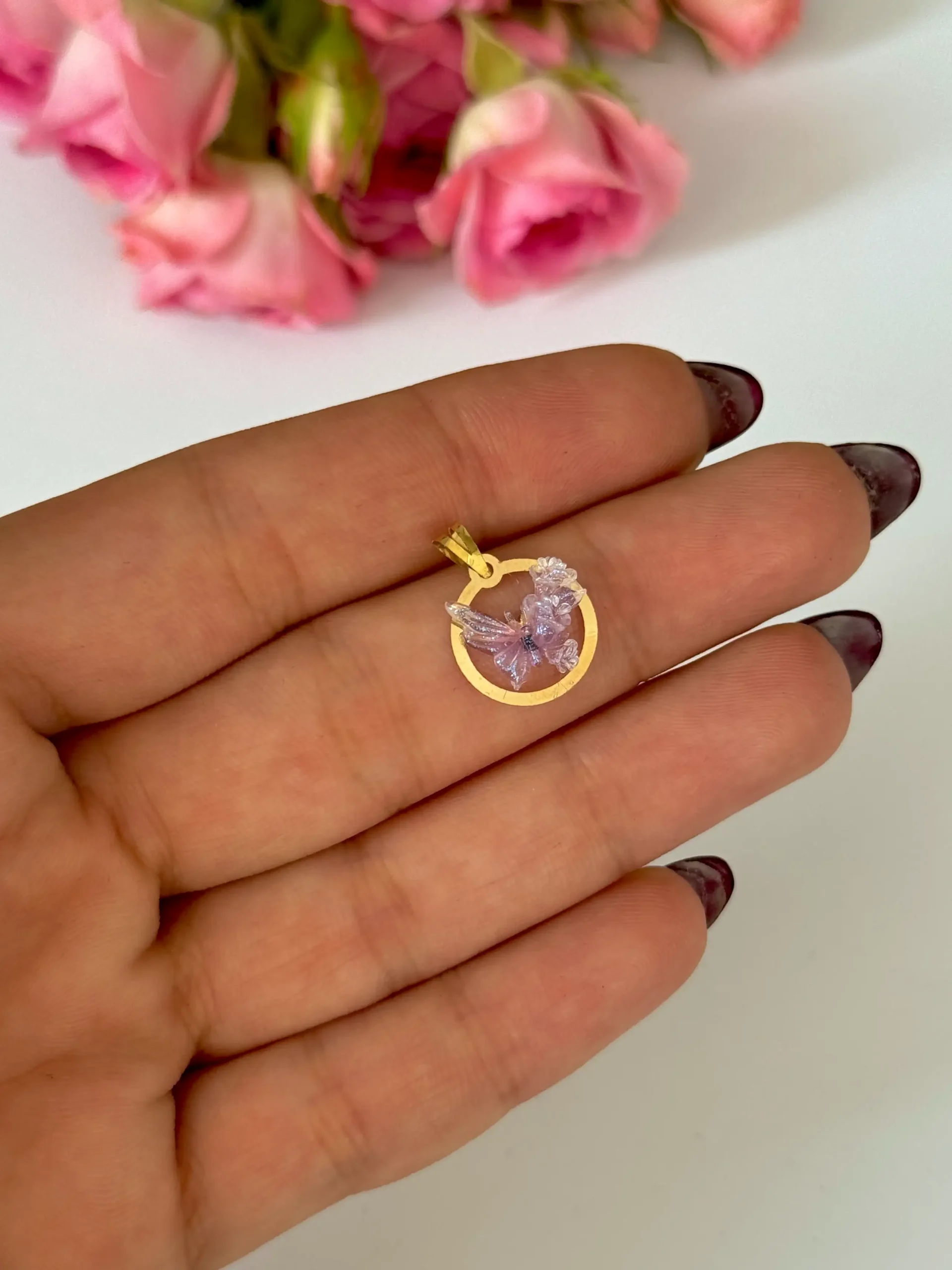 این آویز لطیف و چشمنواز از طلای ۱۸ عیار ساخته شده و ترکیبی از درخشش طلا و ظرافت رنگ را در کنار هم دارد. این طراحی شامل دایرهای توخالی و براق از طلای ۱۸ عیار است که درون آن پروانهای کوچک و ظریف از رزین رنگی قرار گرفته است.