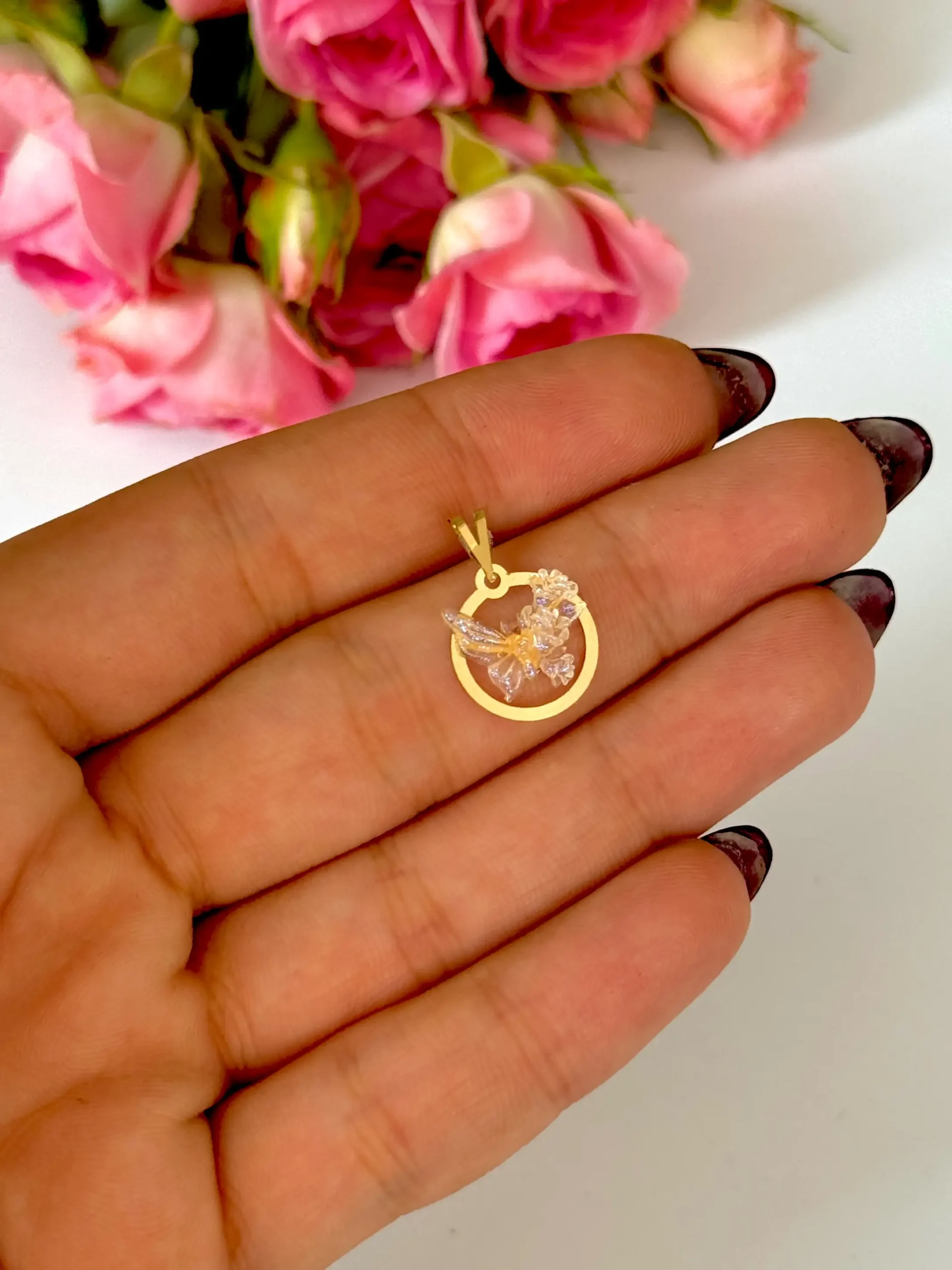 این آویز لطیف و چشمنواز از طلای ۱۸ عیار ساخته شده و ترکیبی از درخشش طلا و ظرافت رنگ را در کنار هم دارد. این طراحی شامل دایرهای توخالی و براق از طلای ۱۸ عیار است که درون آن پروانهای کوچک و ظریف از رزین رنگی قرار گرفته است.