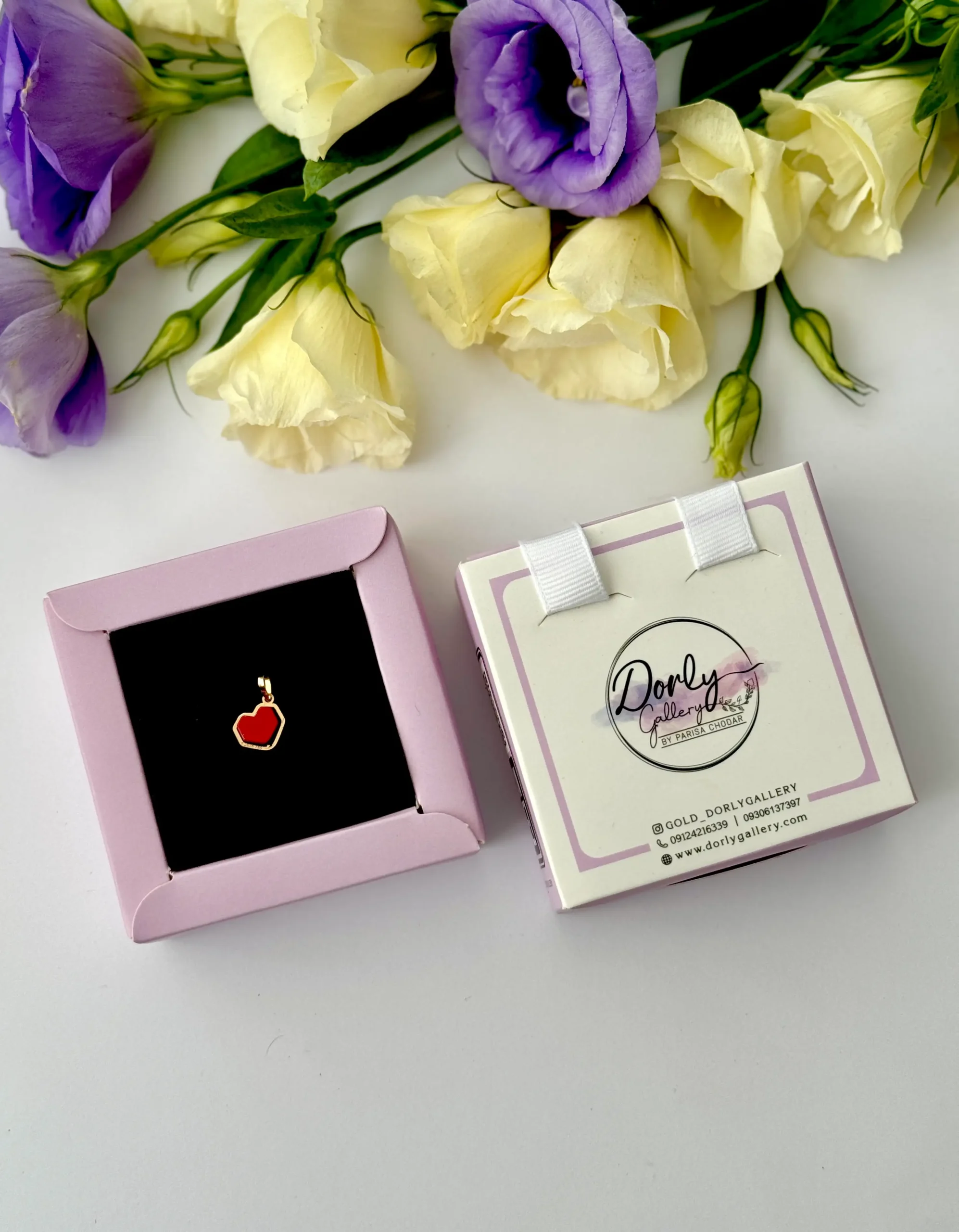 قلب این مدل به شکل چندضلعی و با رنگ قرمز مات طراحی شده که جلوهای مدرن و متفاوت به آن میبخشد. قلب به حالت مورب روی گردن قرار می گیرد و اطراف آن یک قاب طلایی براق و ظریف کار شده که زیبایی و برجستگی قلب را دوچندان کرده است.