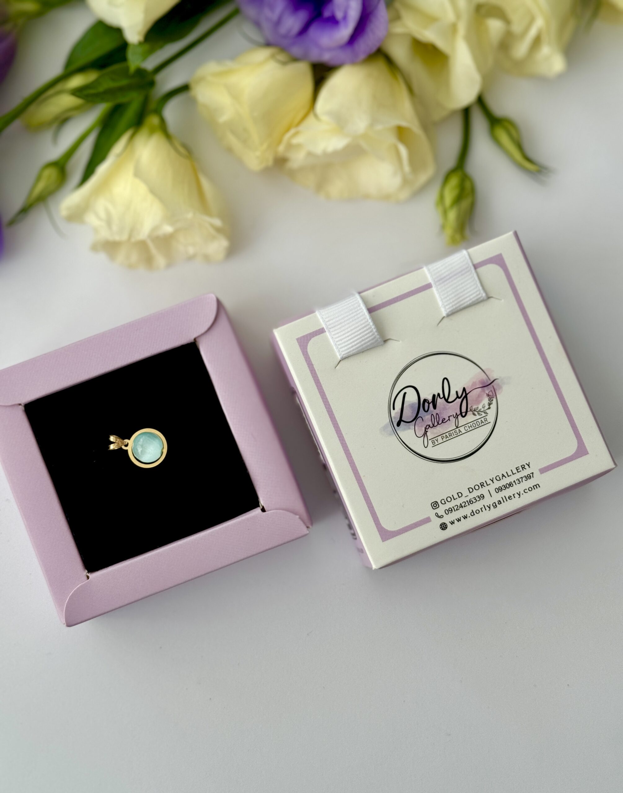 این آویز خاص و چشمنواز از طلای ۱۸ عیار ساخته شده و طراحی آن تلفیقی از درخشش گوی سوارفسکی و ظرافت طلاست. در مرکز این مدل، یک گوی سوارفسکی به رنگ آبی پاستیلی قرار گرفته که جلوهای خیرهکننده ایجاد میکند. این گوی زیبا توسط قاب طلایی صیقلی و براق احاطه شده که درخشش گوی را دوچندان میسازد.