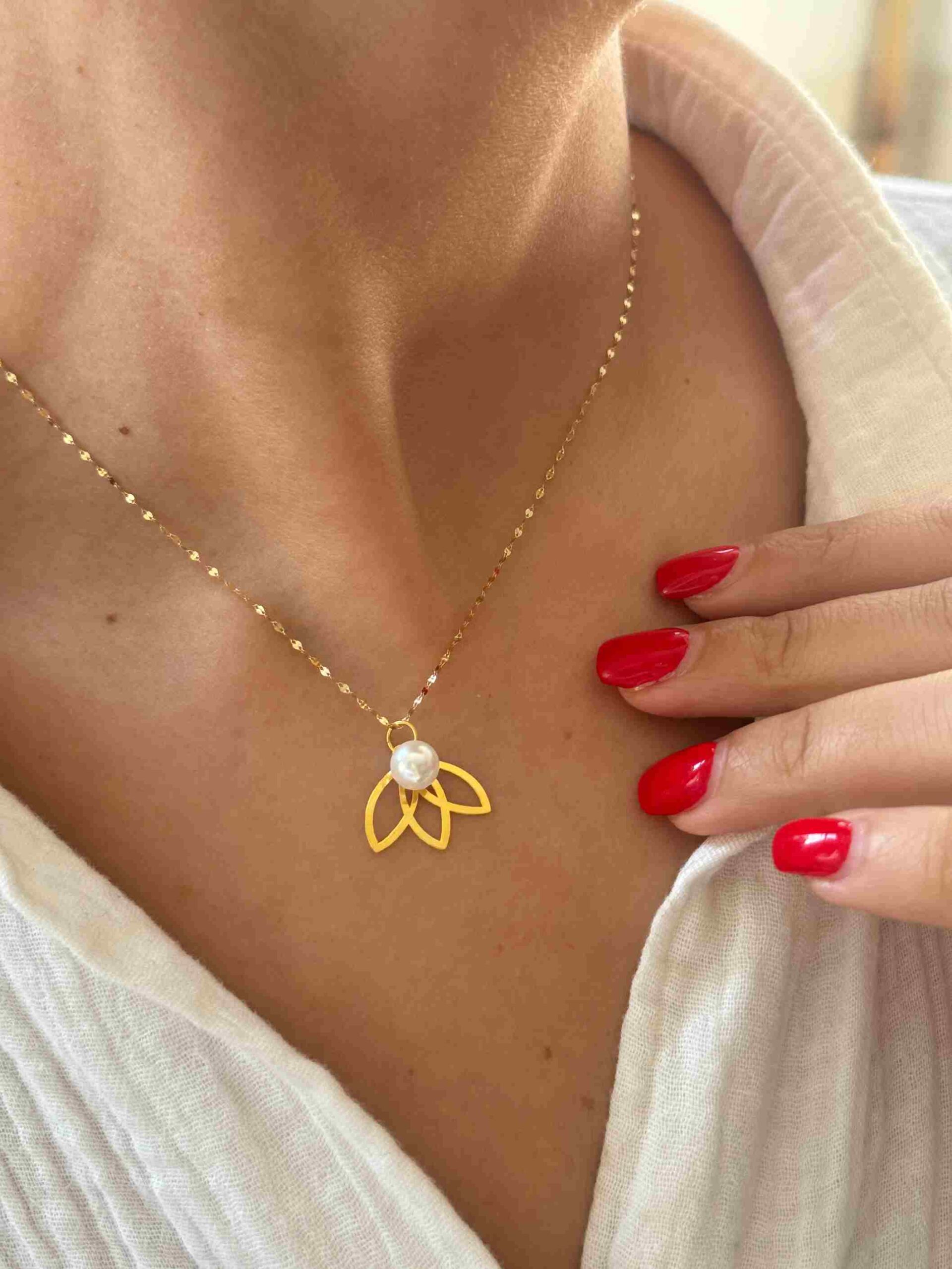 آویز طلا گل لوتوس با طراحی منحصر به فرد، ظرافت و زیبایی را به همراه دارد. در بالای این پلاک یک مروارید درخشان با دقت و هنرمندی چسبیده شده است که جلوه ای خاص به این پلاک می بخشد. این پلاک نه تنها نماد زیبایی و لطافت است، بلکه تداعی گر آرامش و تعادل نیز می باشد.