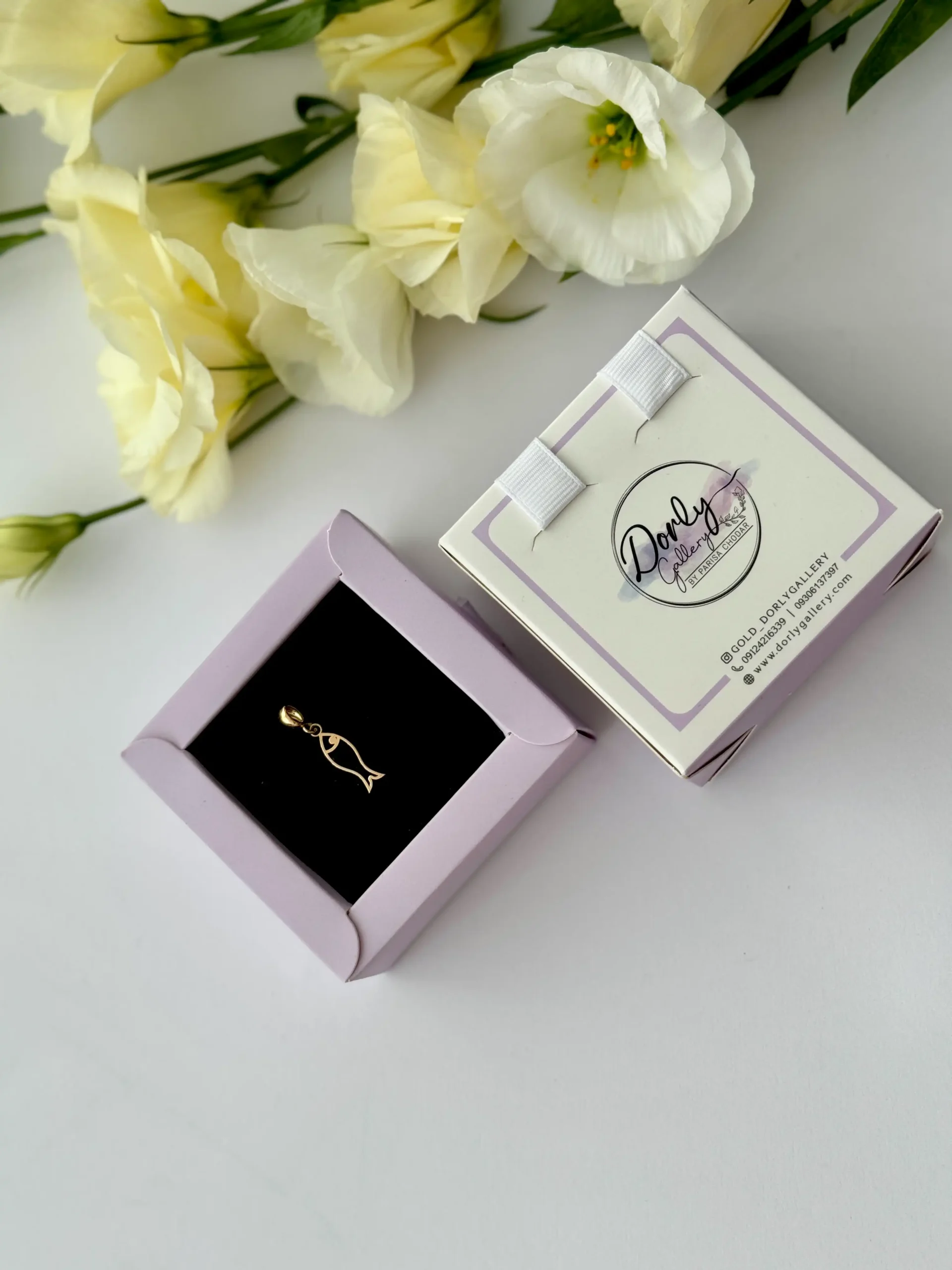 این آویز طلا با طراحی خطی و ظریف، فرم زیبای یک ماهی را به شکلی مینیمال و هنرمندانه به تصویر میکشد. خطوط باریک و براق طلایی با ظرافت تمام، ساختار ساده اما چشمنوازی از ماهی خلق کردهاند که حس آرامش و جاری بودن را منتقل میکند.