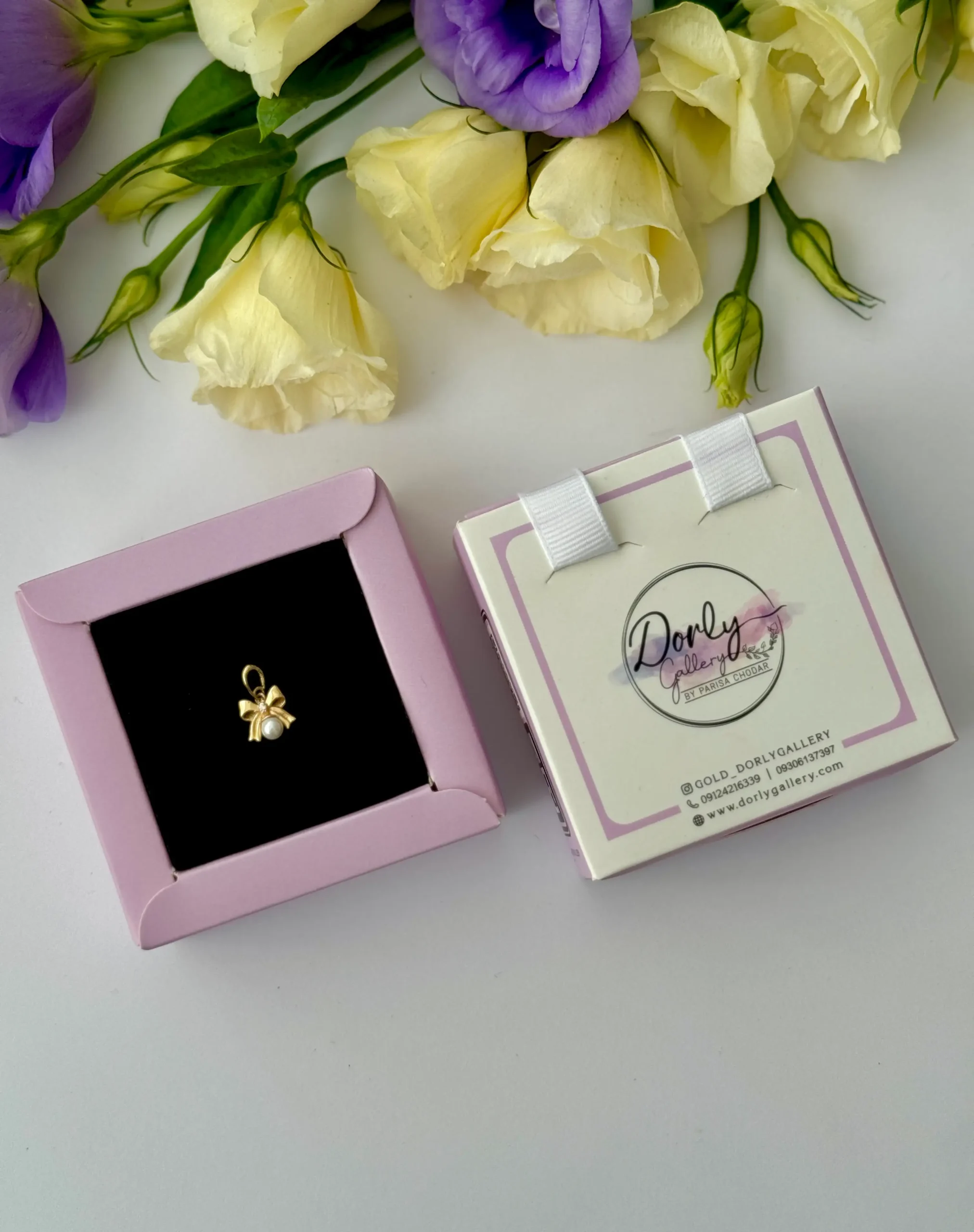 در مرکز پاپیون یک نگین کوچک و درخشان قرار گرفته که جلوهای چشمنواز ایجاد میکند. همچنین یک مروارید سفید و براق از پاپیون آویخته شده که زیبایی و لطافت این اثر را دوچندان میسازد.