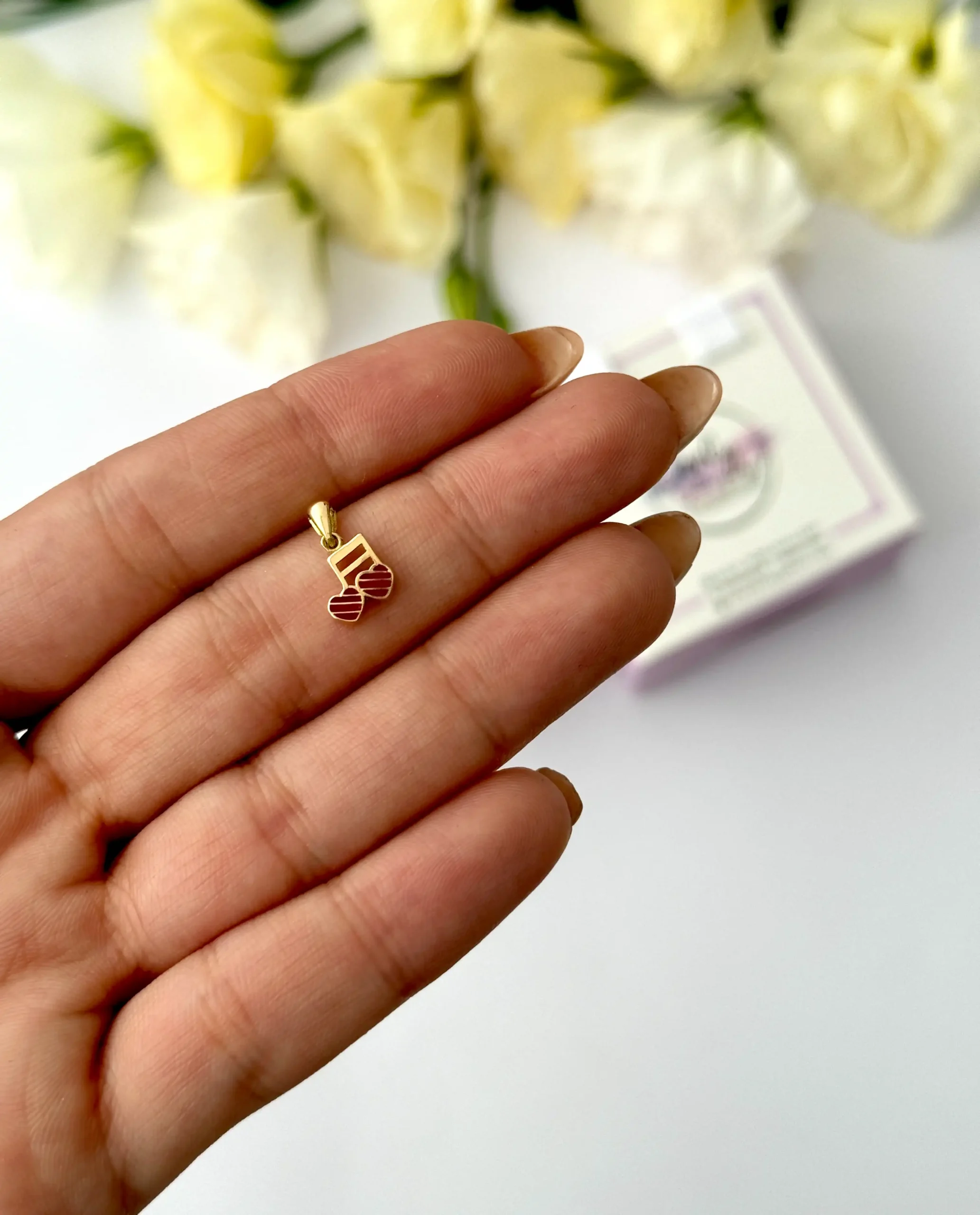 این آویز از طلای ۱۸ عیار ساخته شده و طراحی آن الهامگرفته از نت موسیقی «سل» با تلفیقی ظریف از هنر میناکاری است. فرم اصلی به شکل یک نت سل ظریف و براق طراحی شده که در بخش پایینی خود، دو قلب کوچک و ظریف دارد.