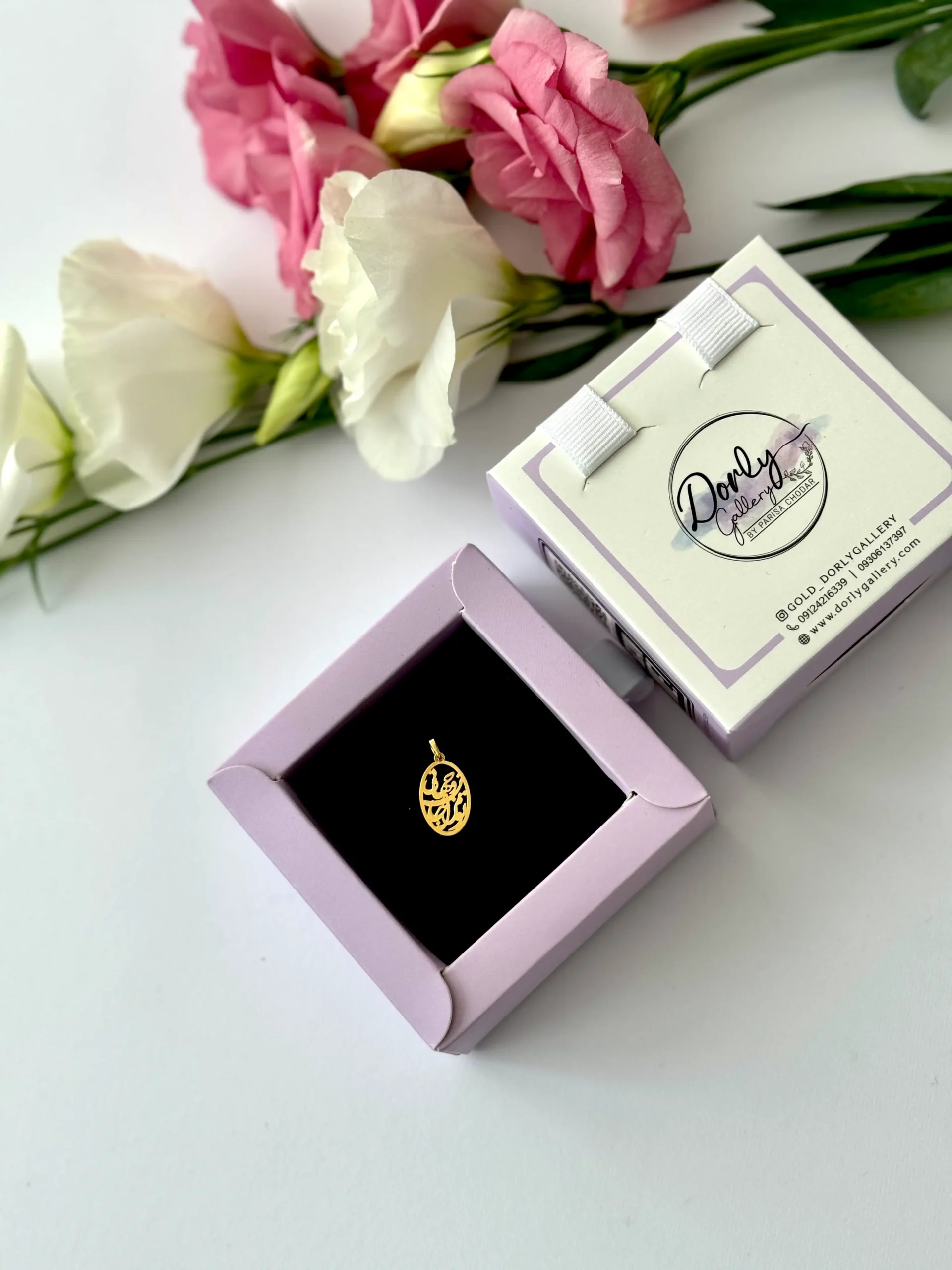 فرم بیضی با لبههای نرم و متقارن، تعادلی بصری و ظاهری شیک ایجاد کرده و نوشته درون آن با چیدمانی متناسب و زیبا قرار گرفته است. سطح طلای آویز کاملاً براق، صیقلی و درخشان است که در کنار ظرافت حروف، جلوهای خاص و چشمنواز میسازد.
