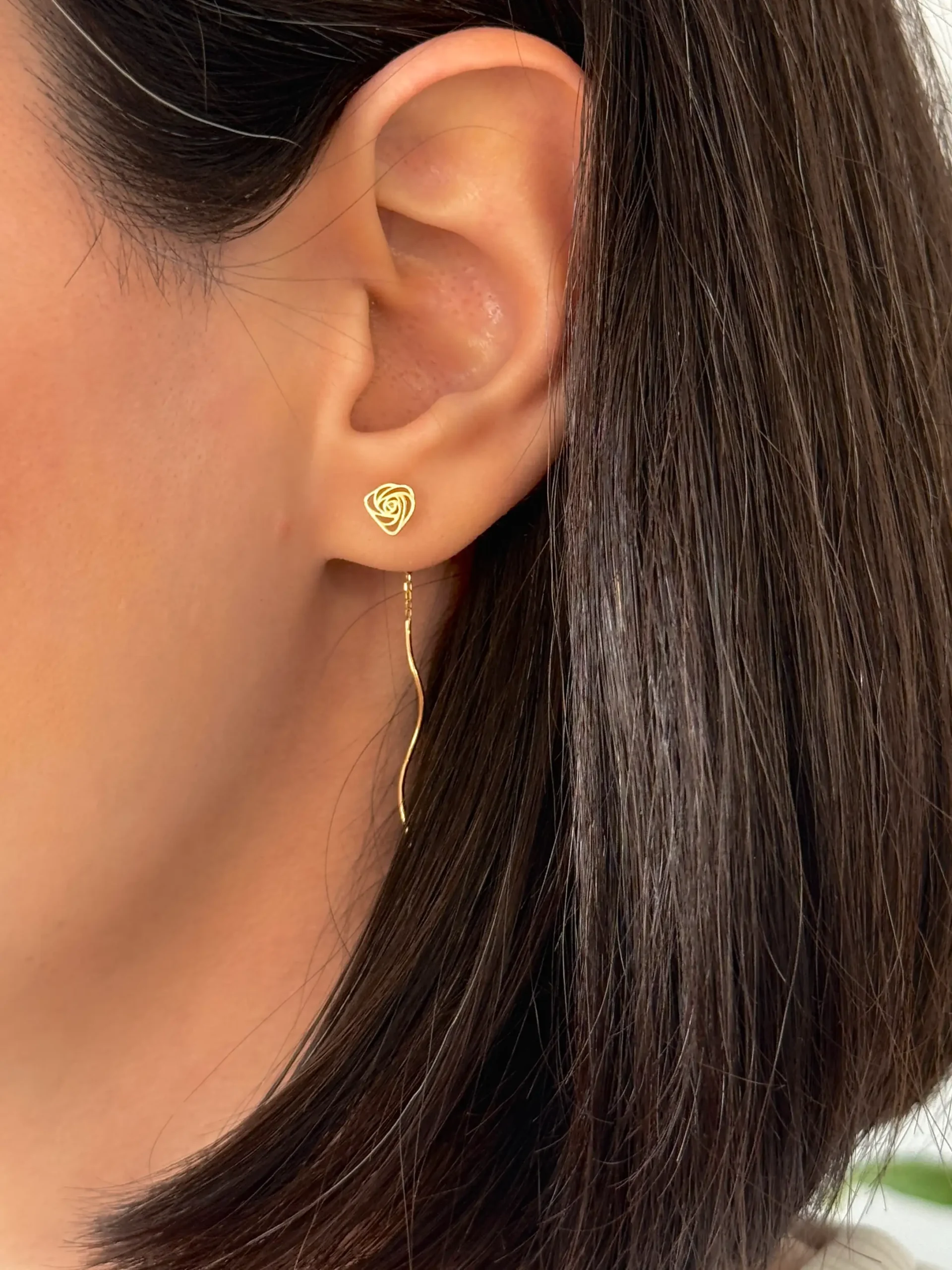 در ابتدا، یعنی بخشی که روی لاله گوش مینشیند، یک گل رز کوچک، توخالی و خطی قرار دارد. این گل رز با خطوطی بسیارظریف طراحی شده و فرم آن بهصورت تو خالی است، این طراحی باعث ایجاد سبکی بصری، لطافت و جلوهای زنانه میشود که بهزیبایی روی لاله گوش مینشیند.