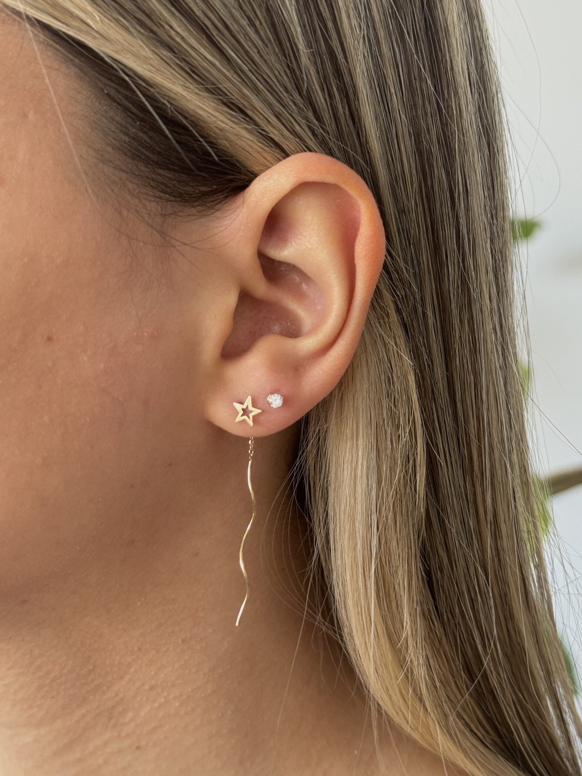 در ابتدای طراحی، یک ستاره کوچک، توخالی و ظریف در انتهای میخ گلگوش قرار گرفته است. این ستاره با فرم خطی و بسیار سبک، روی لاله گوش مینشیند و درخشش ملایم طلای صیقلی آن، در همان لحظهی اول نگاهها را بهخود جلب میکند. فرم توخالی ستاره باعث شده ظرافت آن بیشتر به چشم بیاید و سبکی خاص به گوشواره ببخشد.