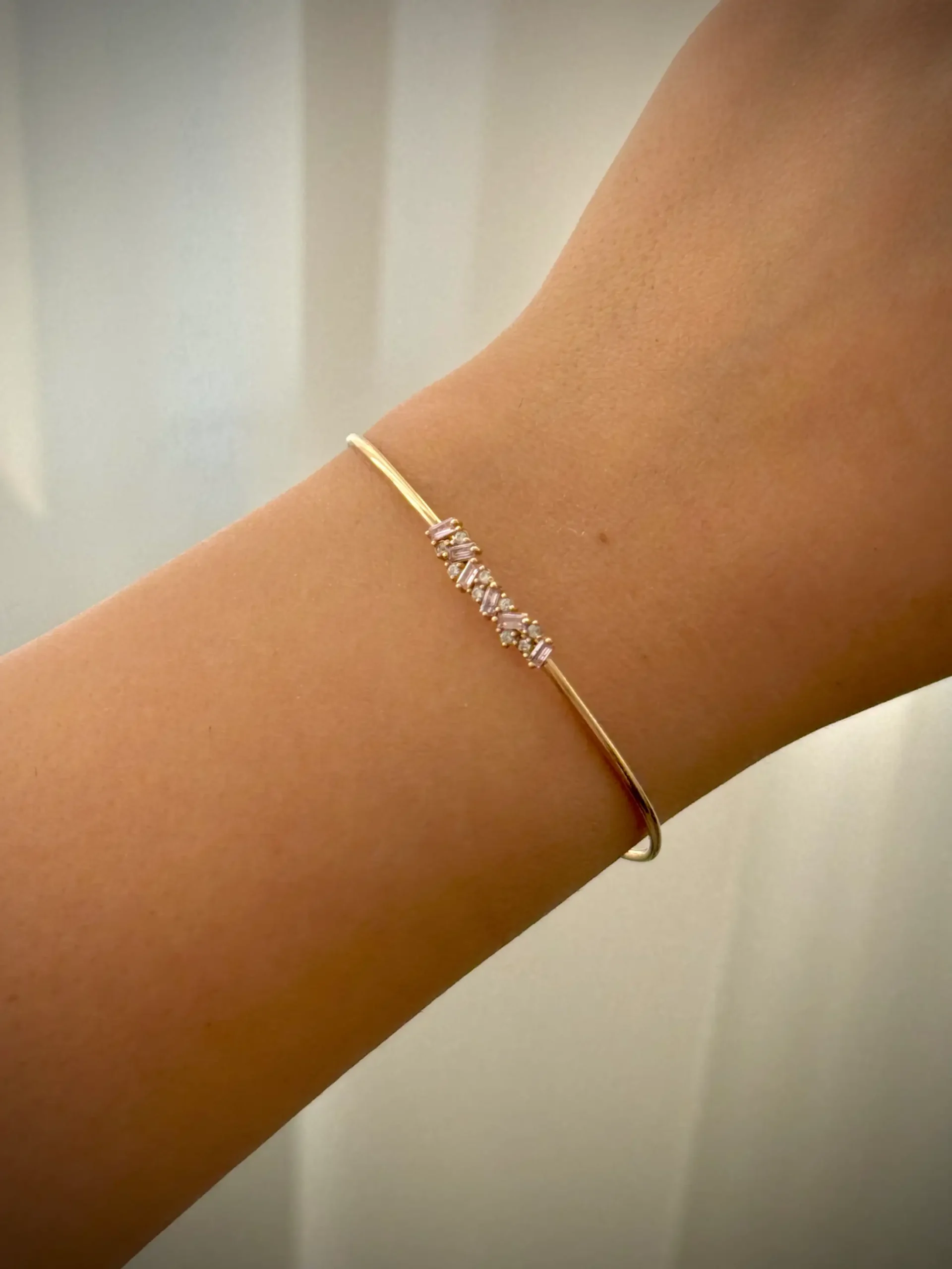 این بنگل زیبا و ظریف از طلای ۱۸ عیار ساخته شده و طراحی آن جلوهای لوکس، زنانه و درخشان دارد. در مرکز این مدل، نگینهای مستطیلشکل به رنگ صورتی روشن در کنار نگینهای ریز و سفید درخشان قرار گرفتهاند و ترکیبی چشمنواز و لطیف ایجاد کردهاند.