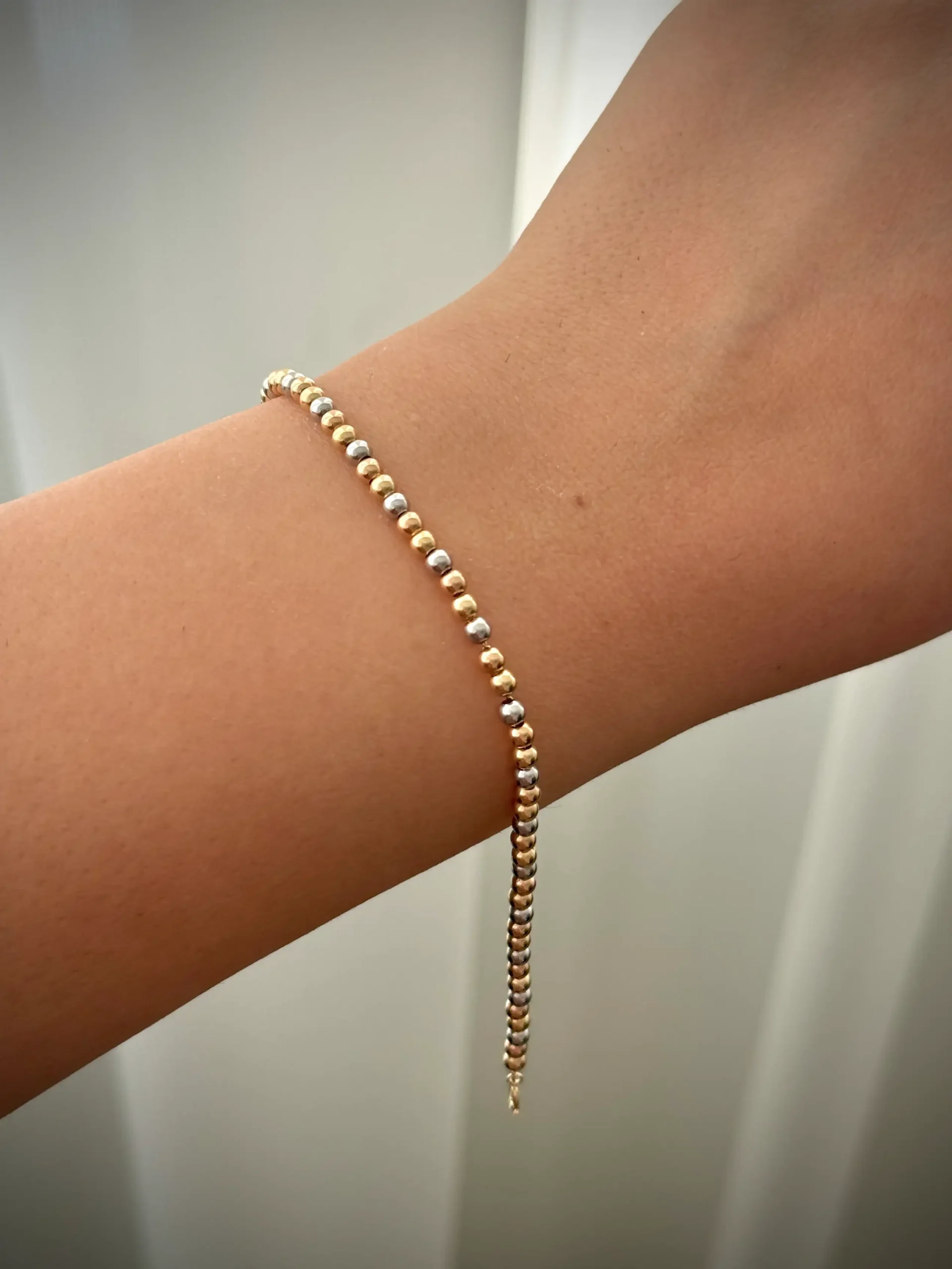این دستبند زیبا و درخشان از طلای ۱۸ عیار ساخته شده و طراحی آن ترکیبی از سادگی، نظم و ظرافت است. در سراسر این مدل، گویهایی هماندازه با سطحی براق و صیقلی در دو رنگ طلایی و سفید در کنار یکدیگر قرار گرفتهاند و زنجیری لوکس و زیبا را تشکیل دادهاند.