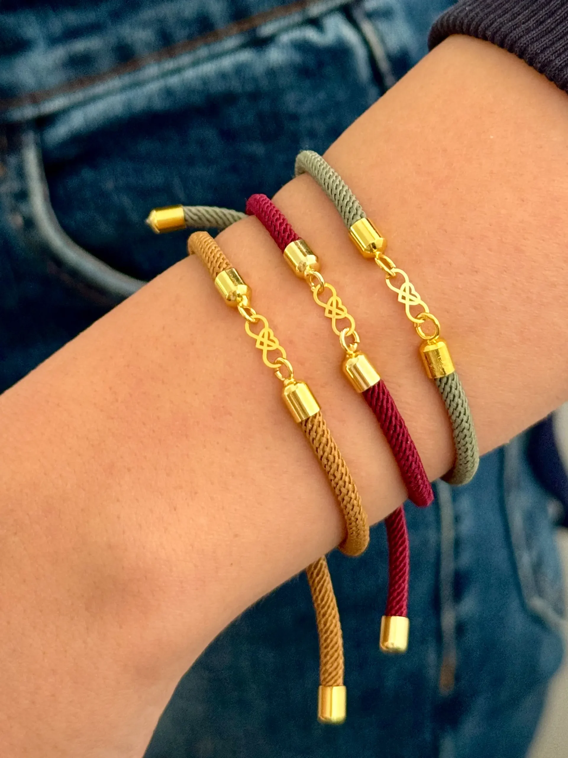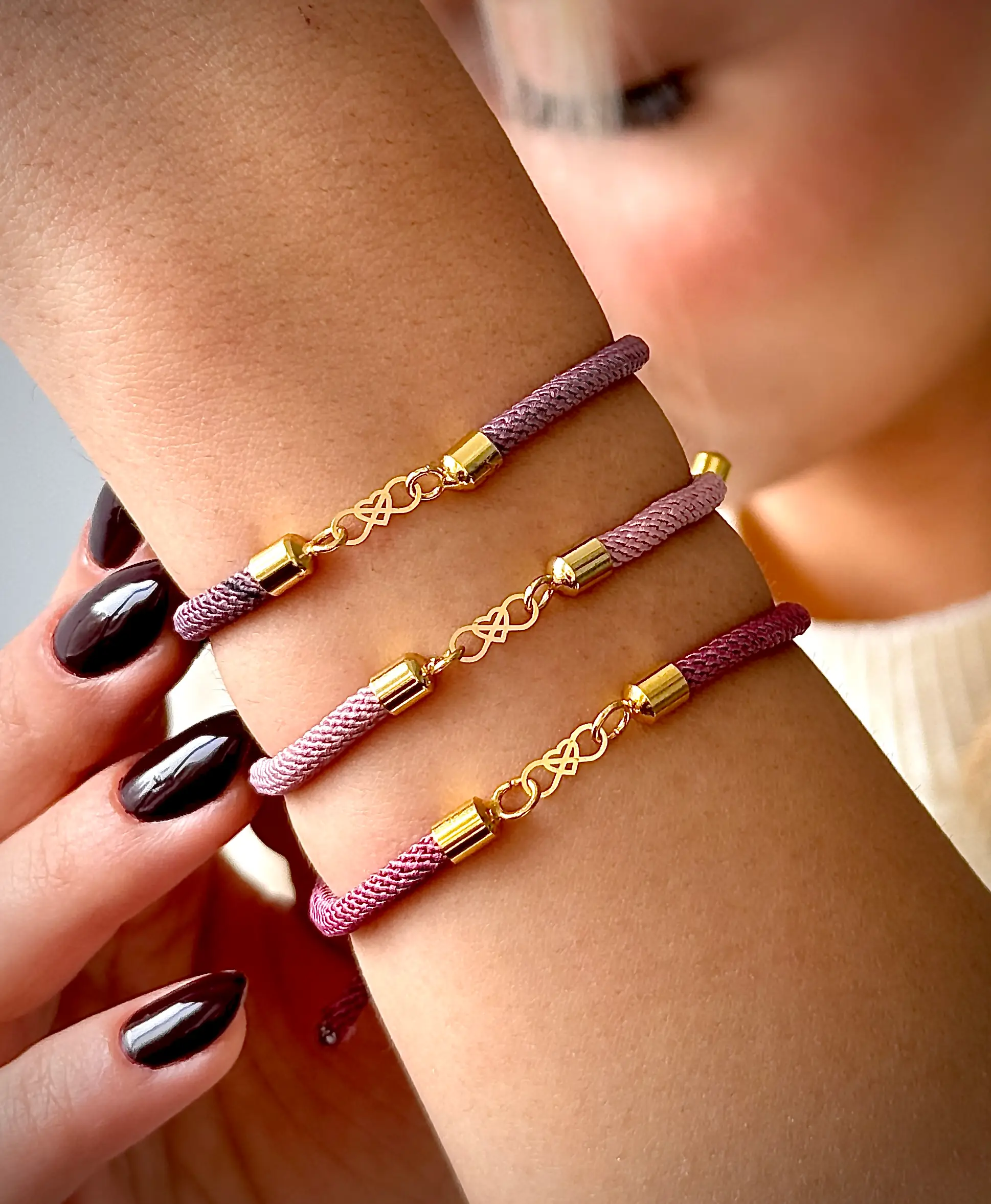 این دستبند بند رنگی با پلاک بینهایت قلبدار از طلای ۱۸ عیار ، ترکیبی از لطافت، مدرن بودن و طراحی مینیمال را به نمایش میگذارد. مرکز بینهایت ، یک قلب خطی و توخالی طراحی شده که جلوهای ظریف و عاشقانه ایجاد میکند.