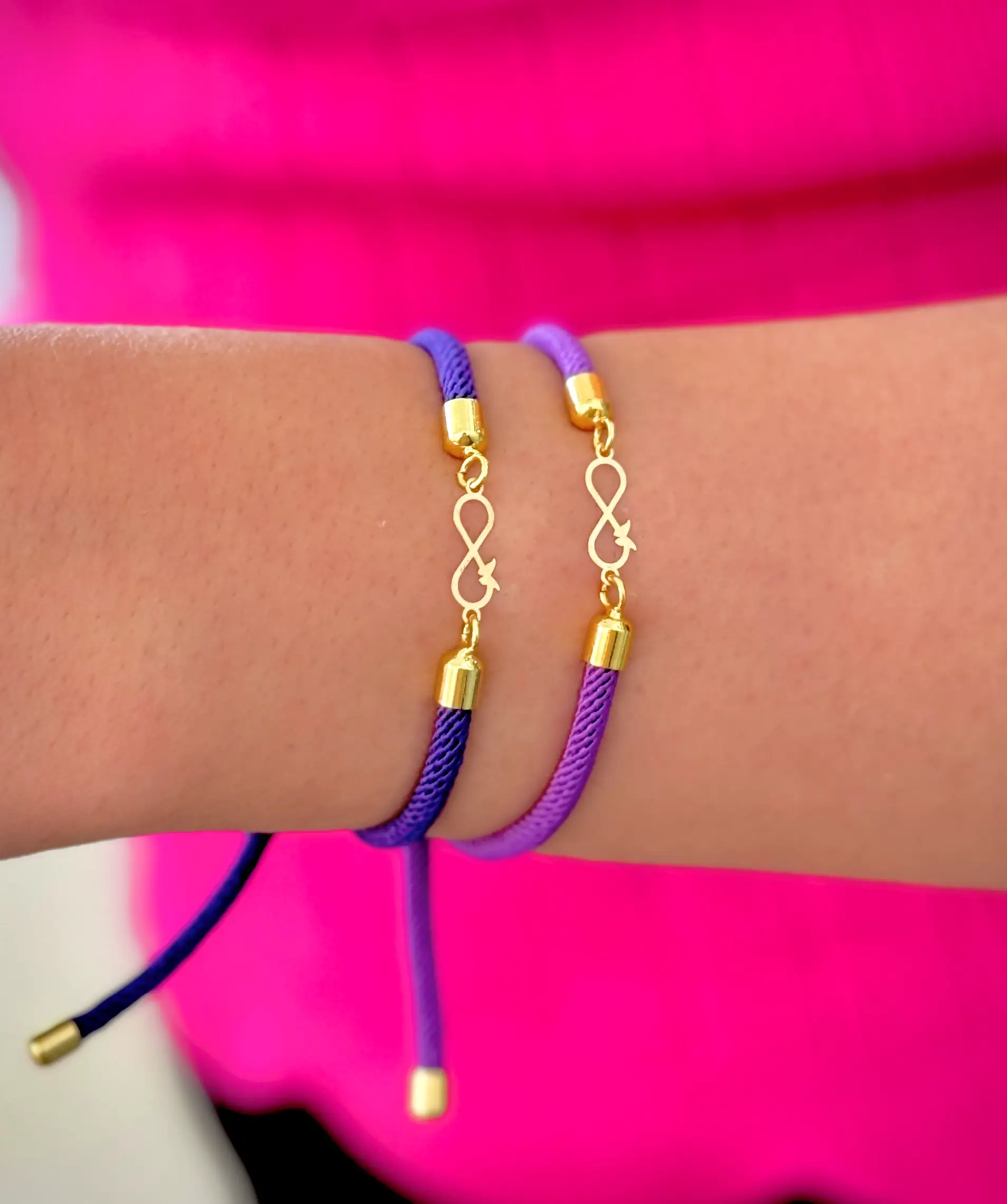 این دستبند ظریف و فانتزی با ترکیب بند رنگی و پلاک طلای ۱۸ عیار، جلوهای شاد، دخترانه و لطیف دارد. پلاک به شکل نماد بینهایت طراحی شده که بهصورت توخالی و خطی اجرا شده و در گوشهی نماد بینهایت، یک پروانهی ظریف و کوچک با سطح صیقلی قرار گرفته که با درخششی ملایم، جلوهای خاص به دستبند میبخشد.