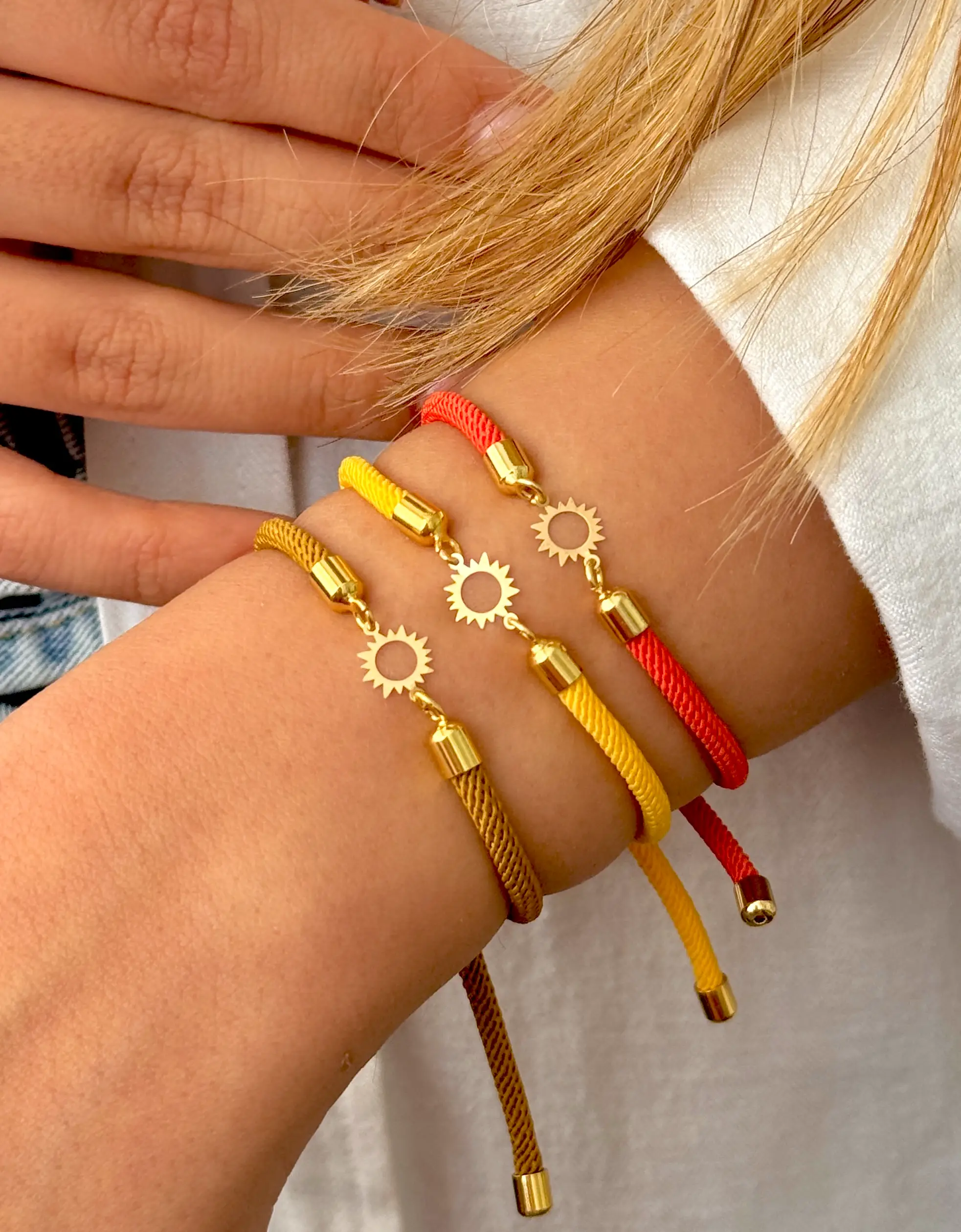 در مرکز بند، پلاک طرح خورشید قرار گرفته که به صورت خطی و توخالی ساخته شده است. ترکیب طلای درخشان با رنگبندی متنوع بند، این مدل را به گزینهای محبوب برای استفاده روزمره و هدیه تبدیل کرده است.