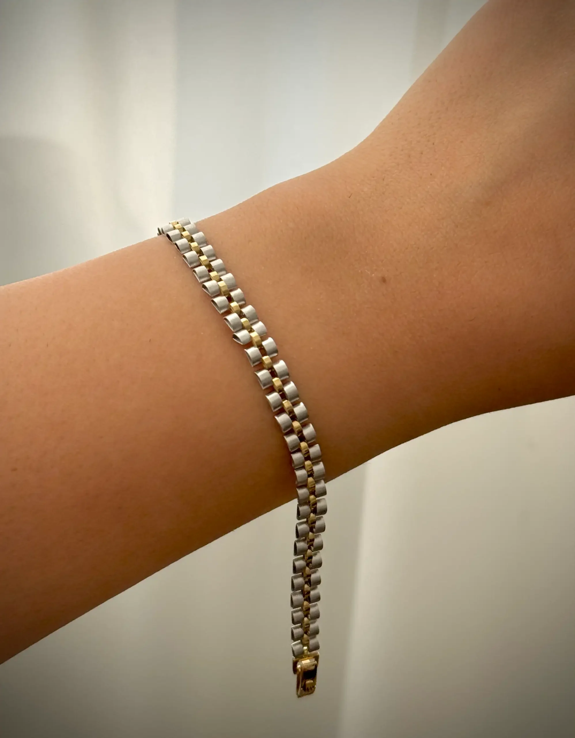 این دستبند زیبا و کلاسیک از طلای ۱۸ عیار ساخته شده و با طراحی خاص زنجیر رولکس جلوهای لوکس و همیشهمد دارد. ترکیب طلای زرد و سفید در این مدل، تضادی چشمنواز ایجاد کرده که هم ظرافت زنانه و هم جلوهای مدرن و قدرتمند به آن میبخشد.