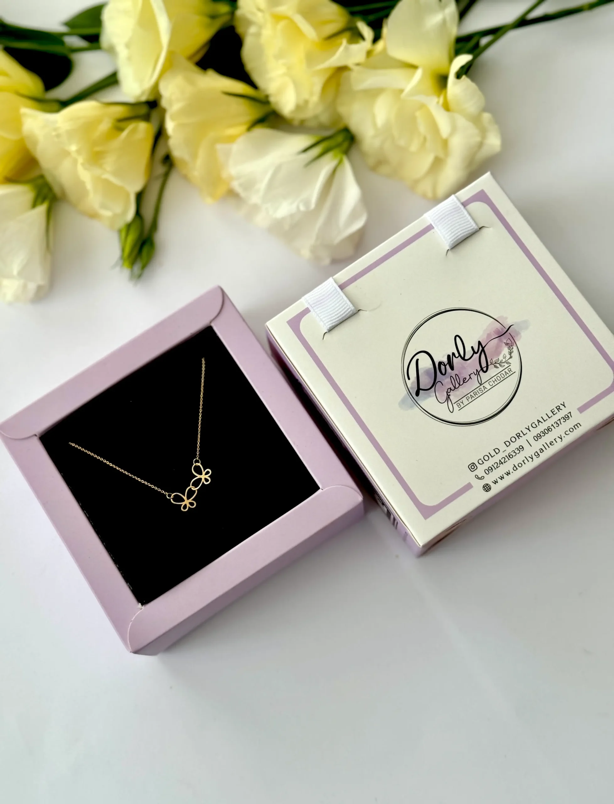 این گردنبند زیبا و فانتزی از طلای ۱۸ عیار ساخته شده است و طراحی آن بهگونهای است که در مرکز زنجیر، دو پروانه خطی و فانتزی به صورت در هم تنیده قرار گرفتهاند. پروانهها با خطوط ظریف و دقیق طراحی شدهاند که به آنها حس سبکی و ظرافت میدهد.