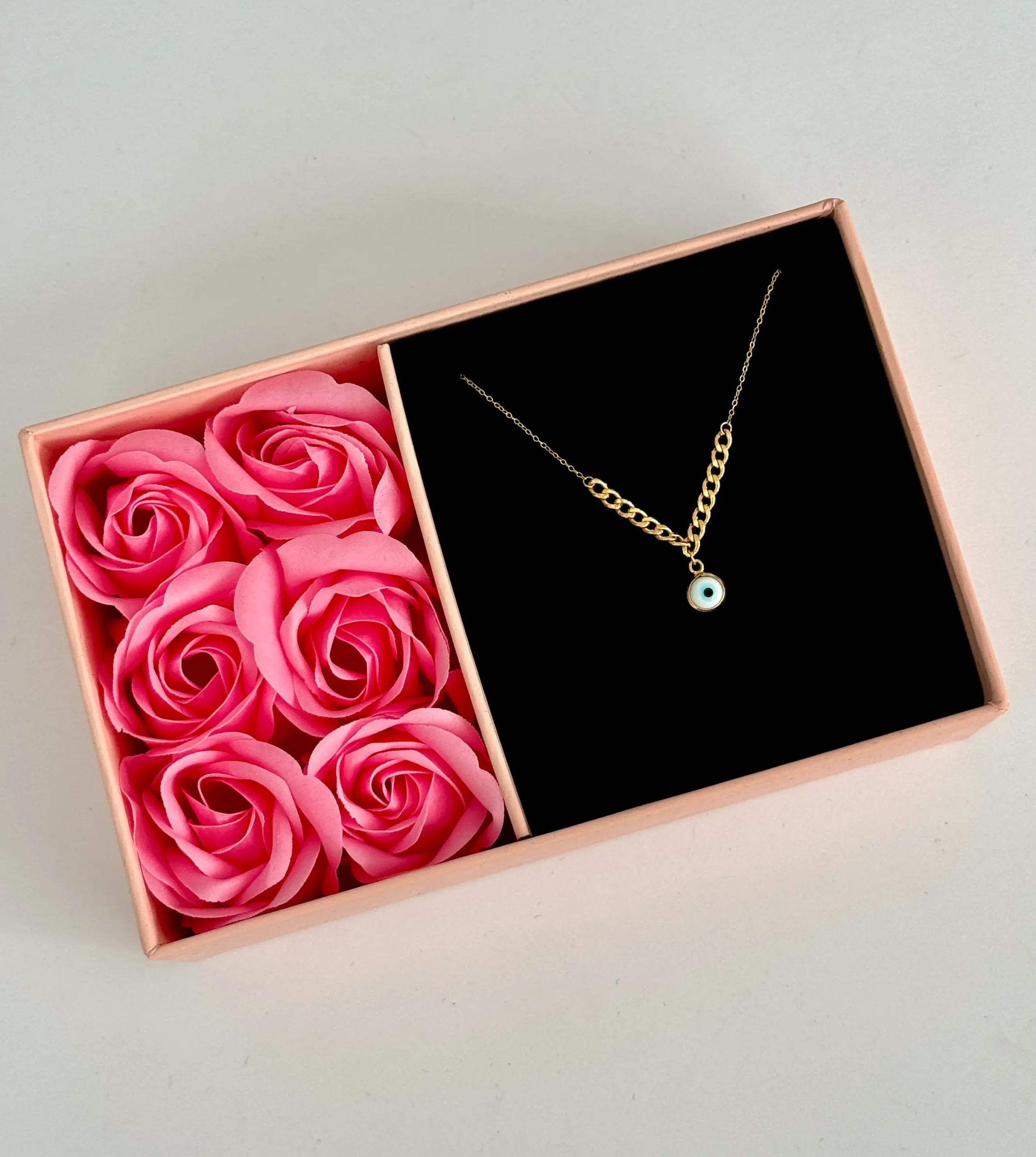 در مرکز زنجیر، یک چشمنظر درون قابی ظریف از طلا آویزان است که نماد محافظت و انرژی مثبت به شمار میرود. ترکیب درخشش طلای زرد با رنگ های چشمنظر، هارمونی خاصی ایجاد کرده و گردنبند را به اثری لوکس و پرمعنا تبدیل کرده است.