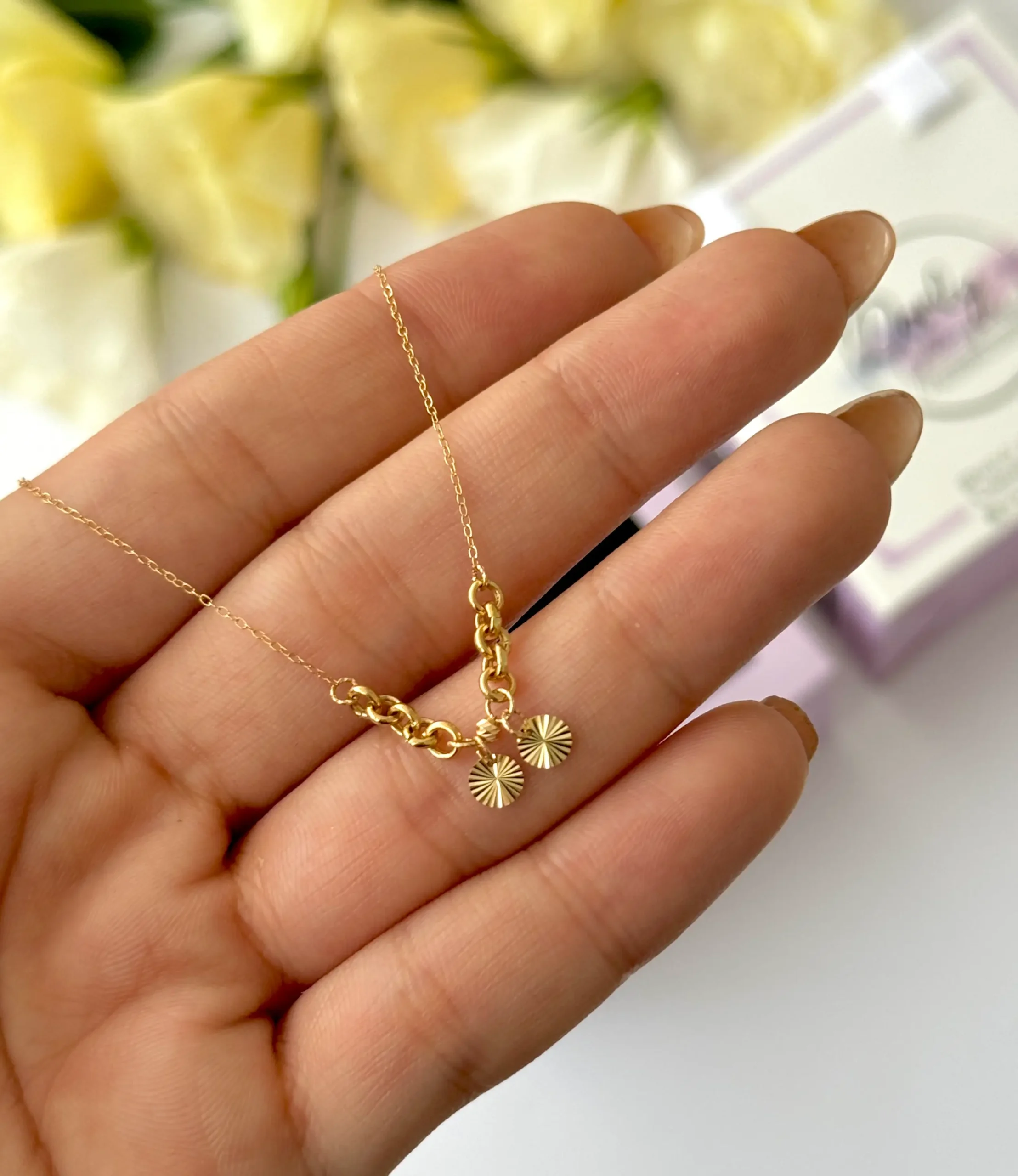 مشخصات گردنبند ” زنجیر متصل ده حلقه تو هم و دو دایره تراش دار آویز و یک گوی البرنادو “