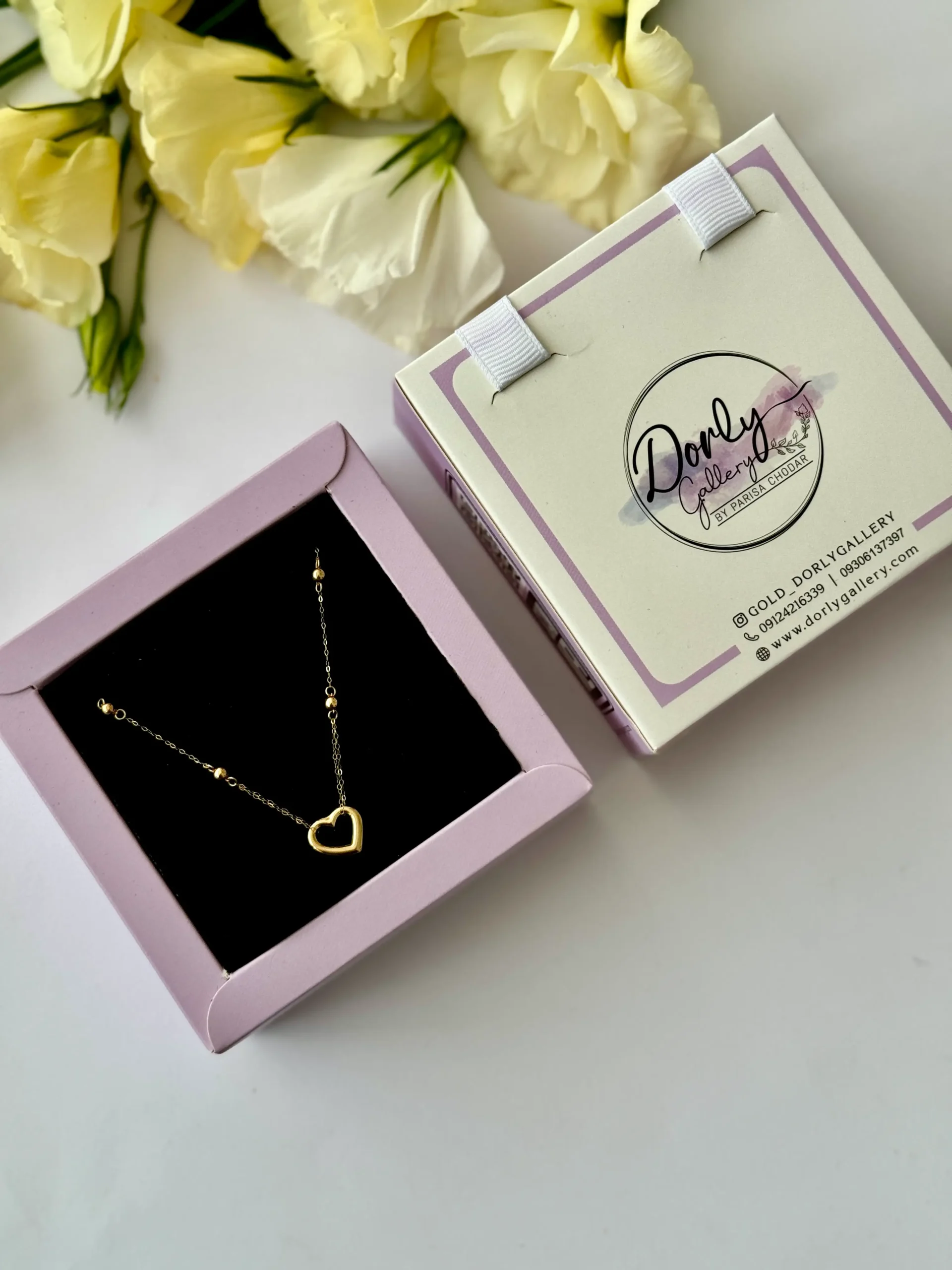این گردنبند خاص و متفاوت از طلای ۱۸ عیار ساخته شده و طراحی آن ترکیبی از ظرافت و زیبایی مدرن است. در مرکز زنجیر، یک قلب توخالی با حالتی مورب، فانتزی و حجمدار قرار گرفته که جلوهای چشمگیر و عاشقانه ایجاد میکند.