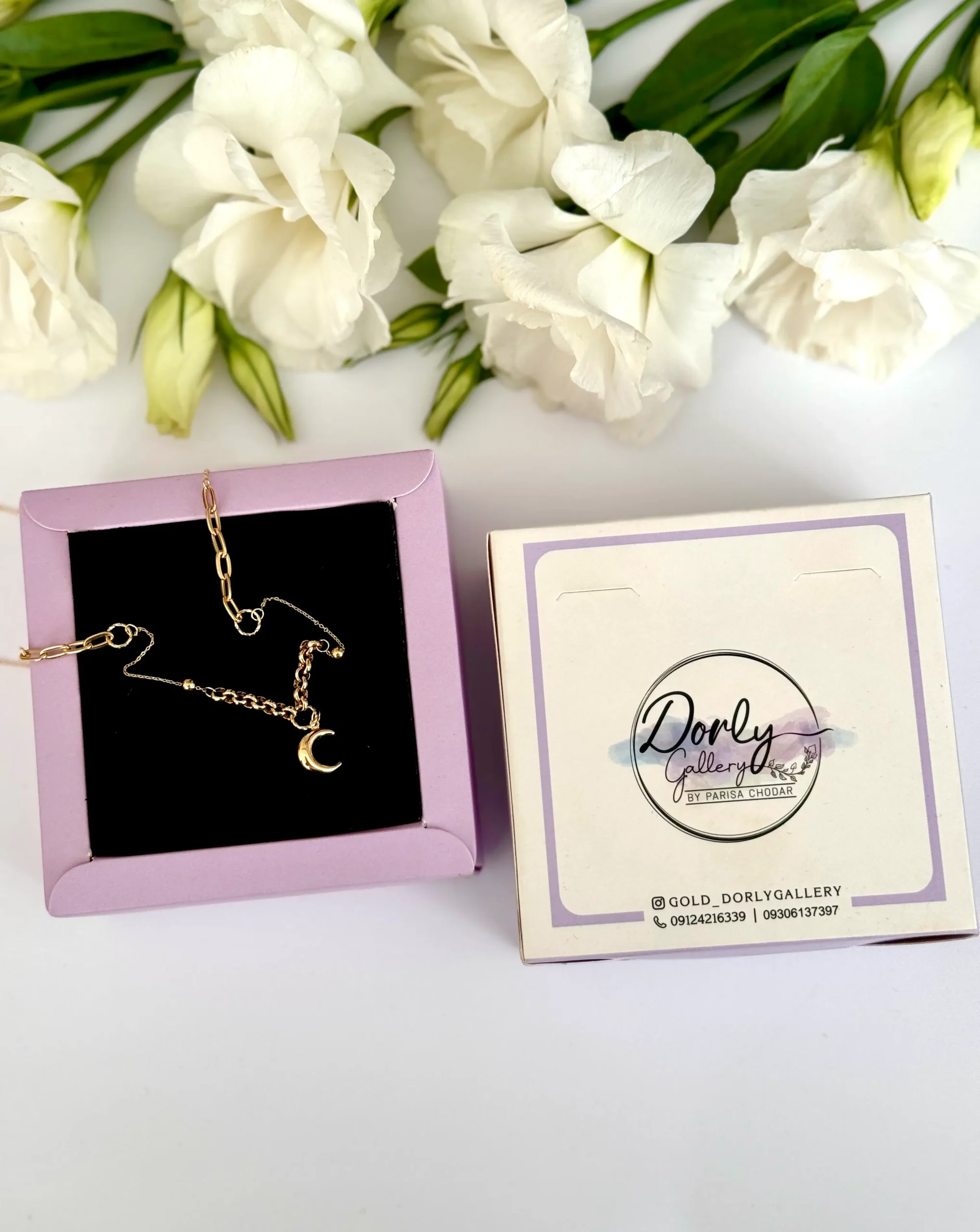 ترکیب این طراحی ساده و ظریف با فرم داملهی ماه، باعث شده این گردنبند برای هر استایل و موقعیتی مناسب باشد، از استفاده روزمره گرفته تا مهمانیها و مناسبتهای خاص.