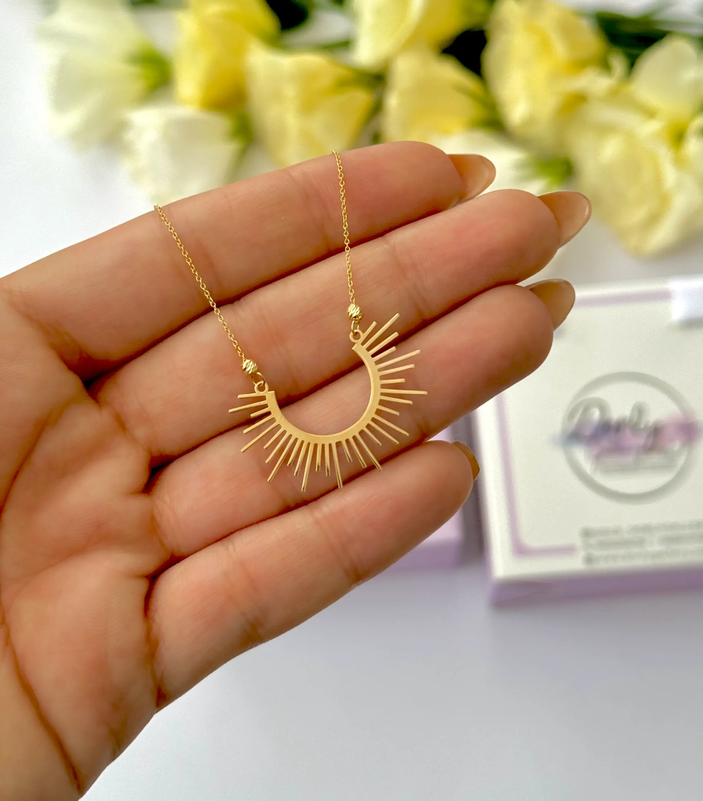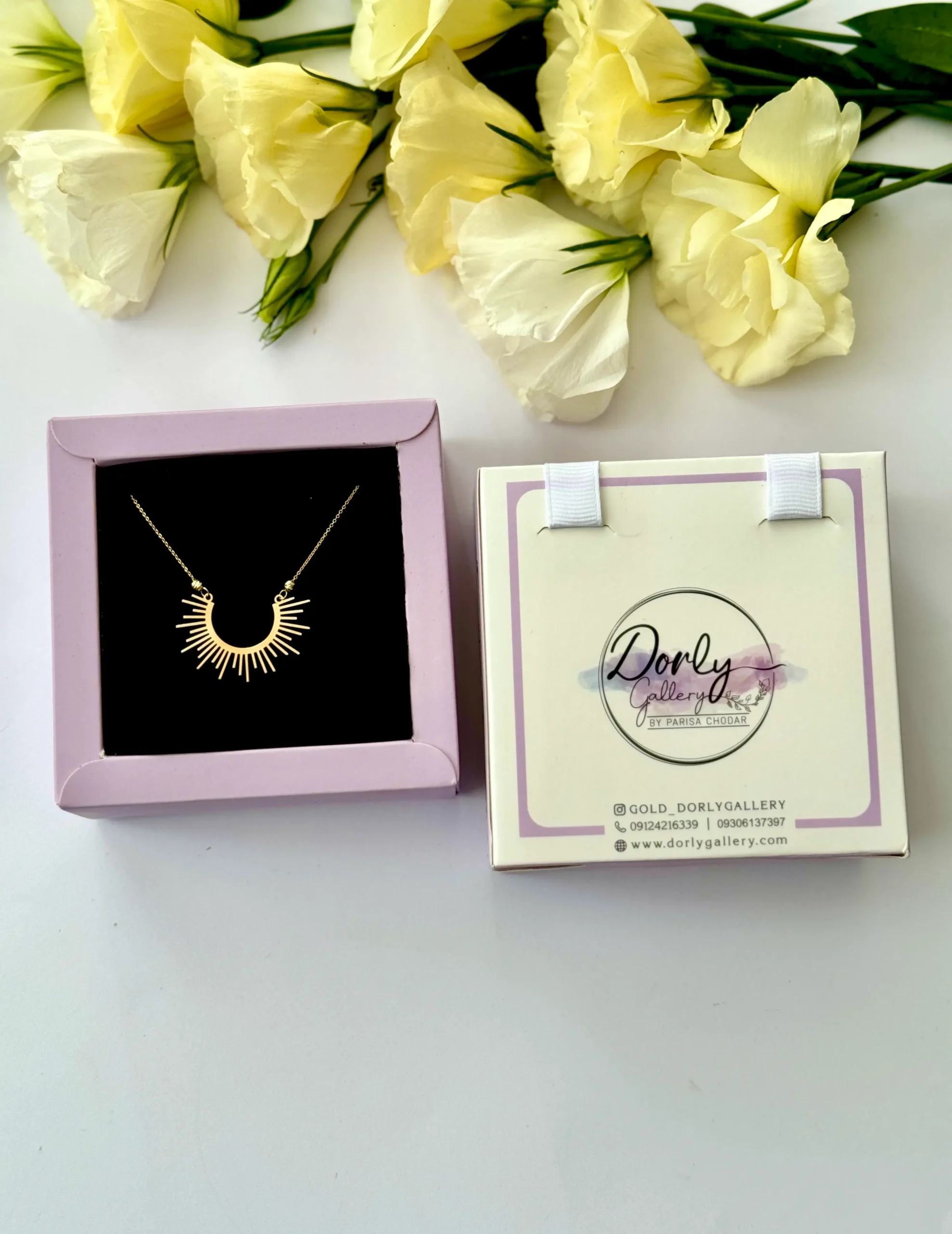 این گردنبند خاص و چشمنواز از طلای ۱۸ عیار ساخته شده و طراحی آن ترکیبی از ظرافت و درخشش است. در مرکز زنجیر، یک پلاک خورشید تابان به صورت مینیمال قرار گرفته که پرتوهای آن به صورت خطوط ظریف طلایی طراحی شده و جلوهای گرم و درخشان به گردن بند میبخشد.