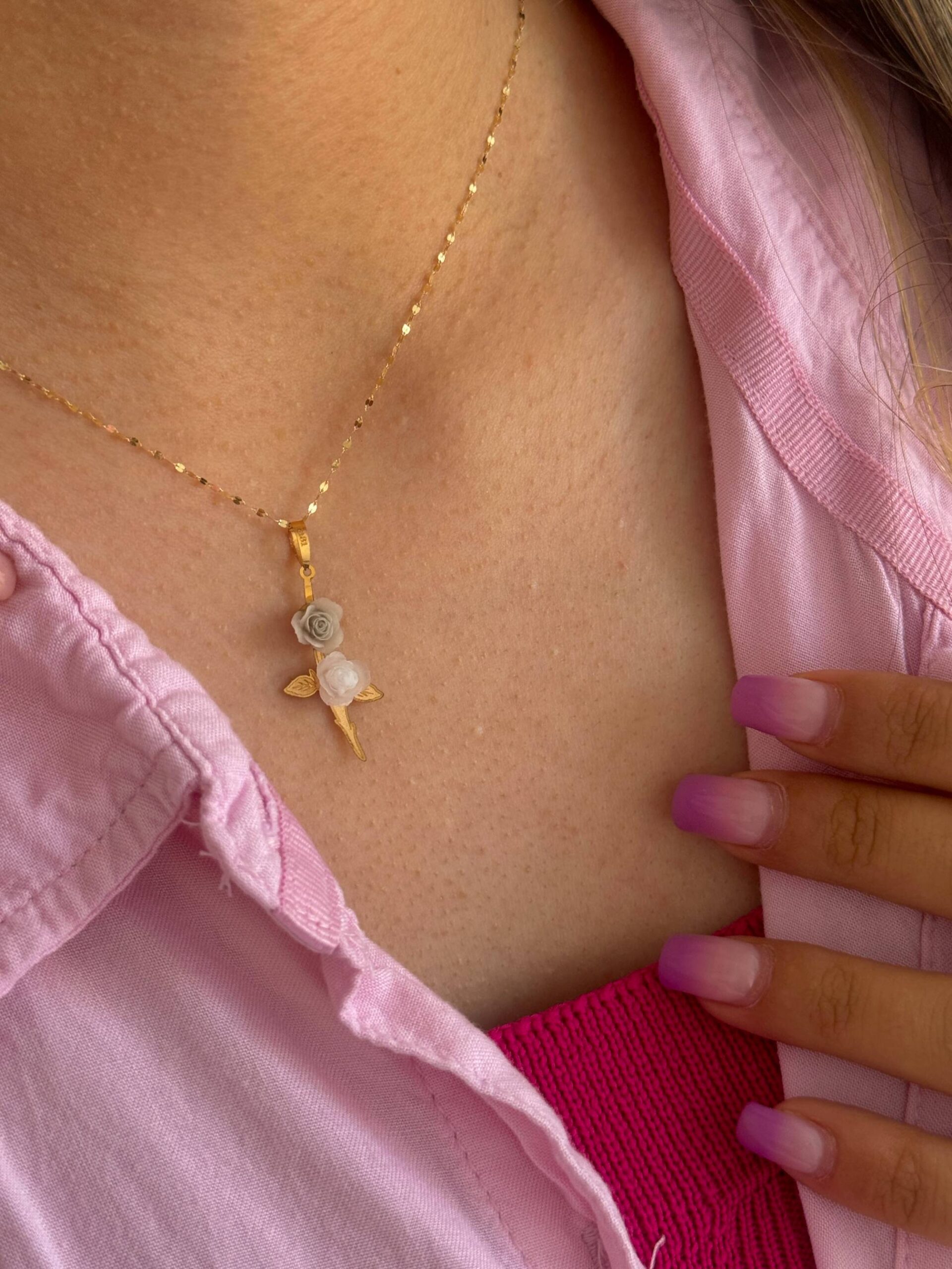هر دو گل از جنس گل چینی ظریف و دستساز هستند و با دقت بسیار بالا به شکل سهبعدی فرم داده شدهاند. ترکیب این رنگها با طلای مات، حس زنانگی، لطافت و اصالت را بهخوبی تداعی میکند.