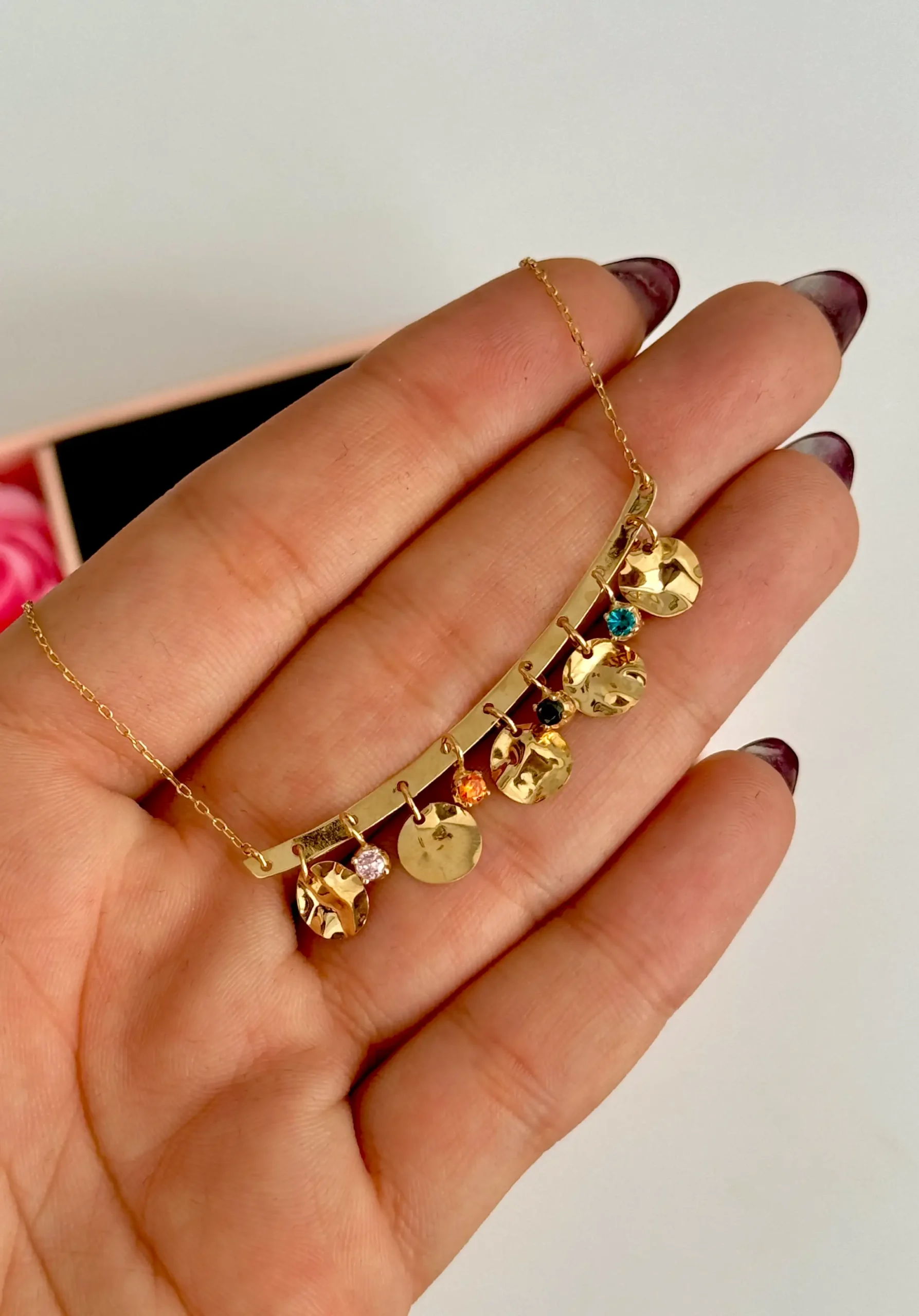 در مرکز زنجیر، یک خط طلایی ظریف به شکل هلال قرار گرفته که از آن پنج دایره چکشی با سطحی صیقلی و درخشان، چهار گوی نگیندار رنگی با رنگ های صورتی روشن، نارنجی روشن، مشکی و آبی روشن آویز شدهاند.