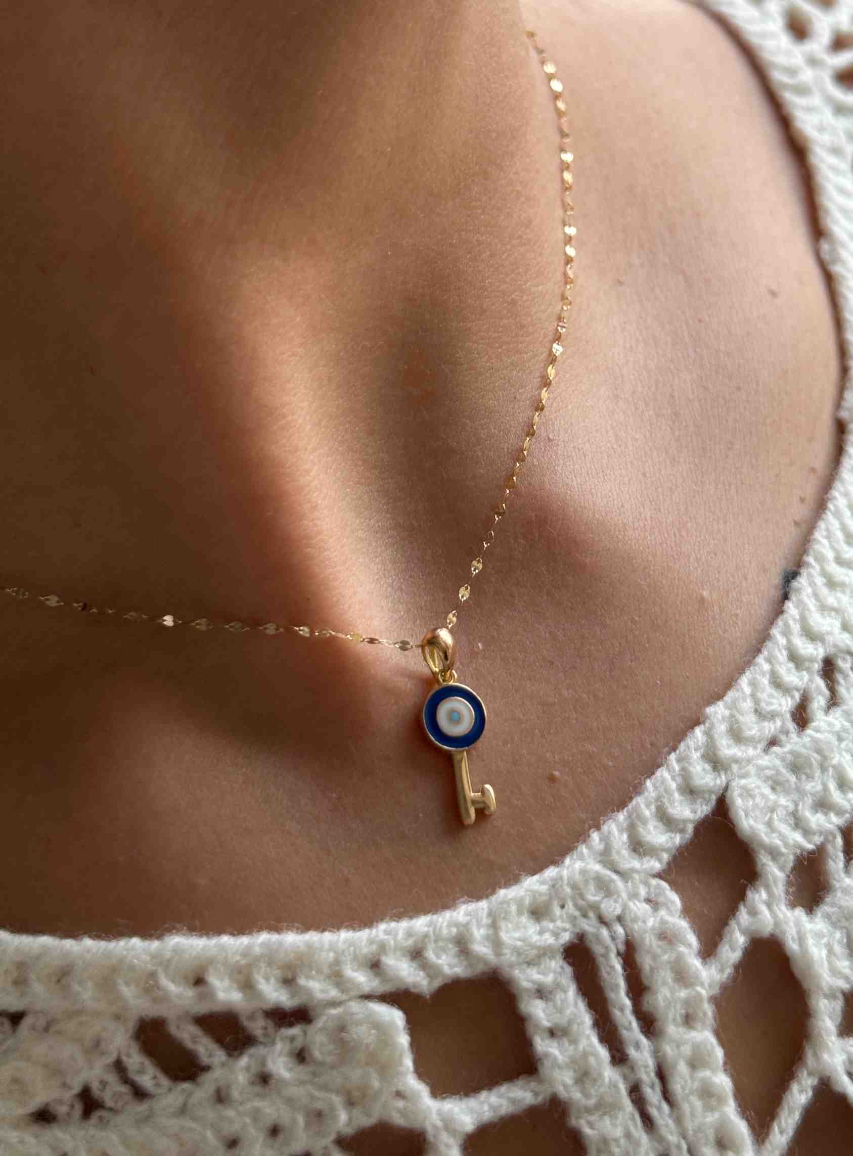 این آویز طلا با طراحی خاص به شکل کلید ساخته شده که نماد گشایش درهای خوشبختی و فرصتهای نو است. قسمت بالایی کلید به شکل دایره طراحی شده است. که در این قسمت یک چشم نظر دایرهای شکل قرار گرفته که با هنر میناکاری ظریف تزئین شده است.