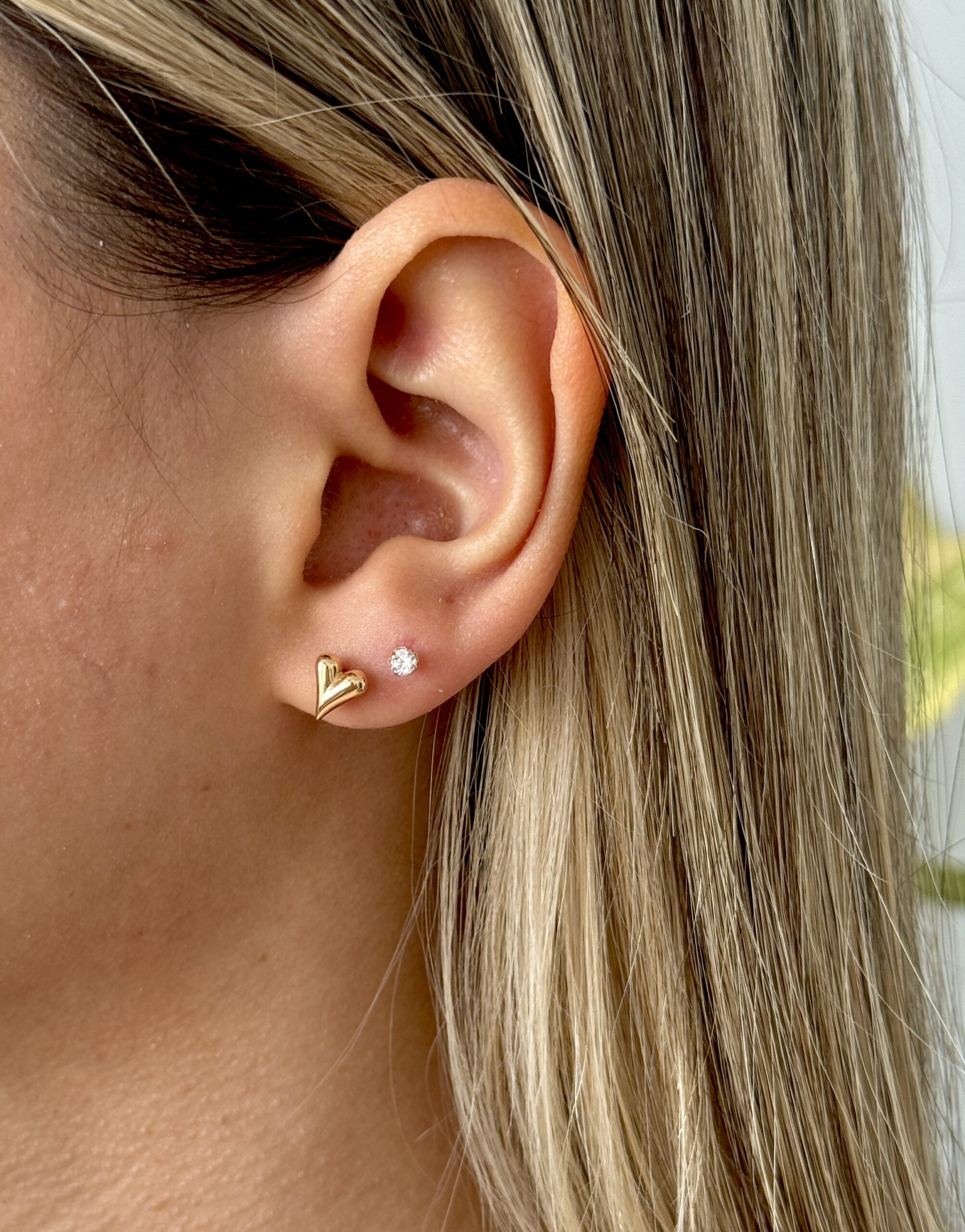 این گوشواره طلا میخی با طراحی قلبی کشیده و برجسته از طلای ۱۸ عیار ساخته شده و با سطحی صیقلی، براق و سهبعدی جلوهای ظریف، رمانتیک و درخشان دارد.