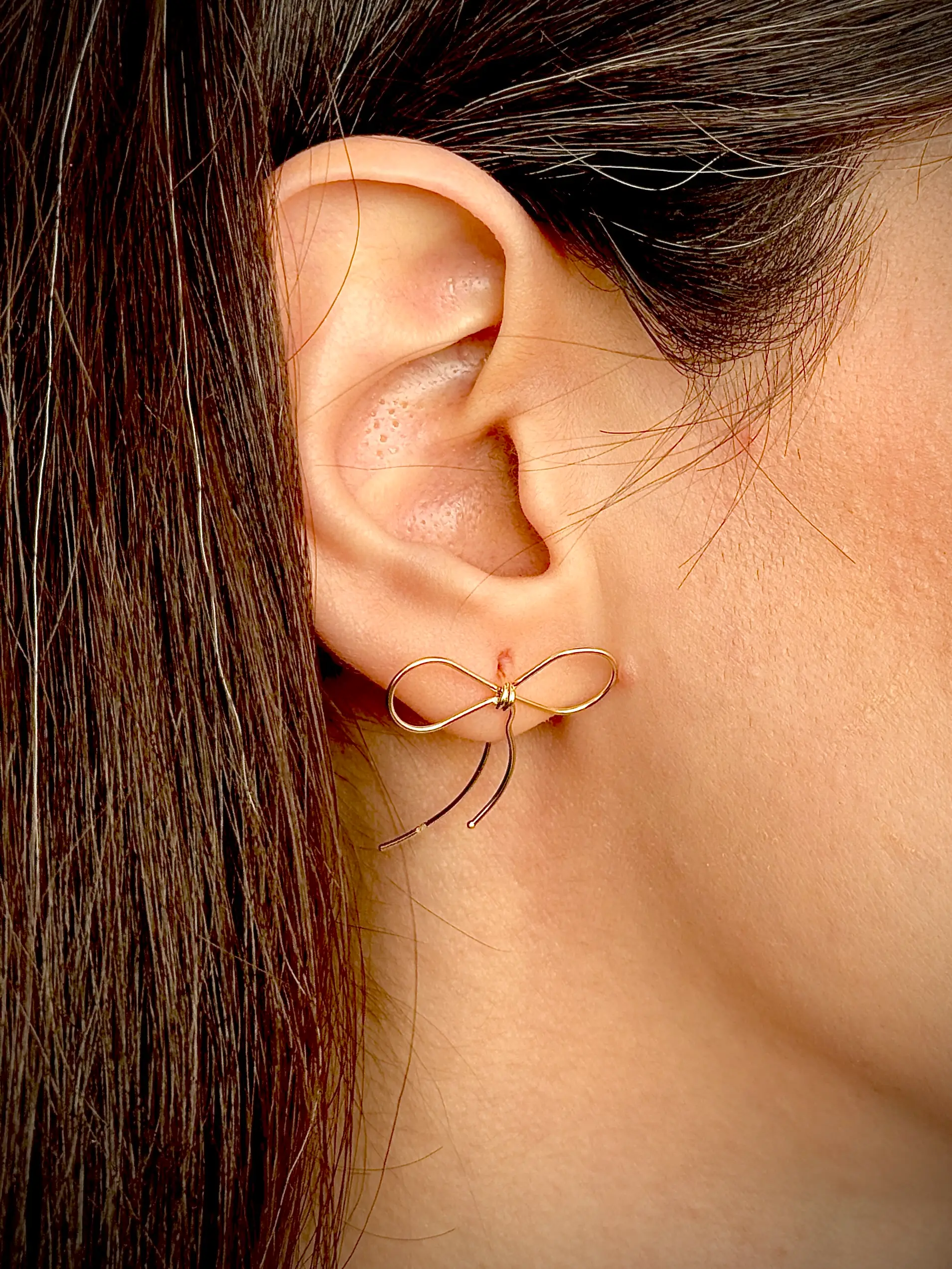 یکی از دنبالههای پاپیون وارد پشت گوش شده و از پشت گوش آویزان میشود، در حالی که دنباله دیگر از روی گوش آویز می شود و جلوهای خاص و متفاوت ایجاد میکند. این طراحی خاص، گوشواره را همزمان ساده و جذاب میکند و جلوهای سهبعدی به آن میبخشد.