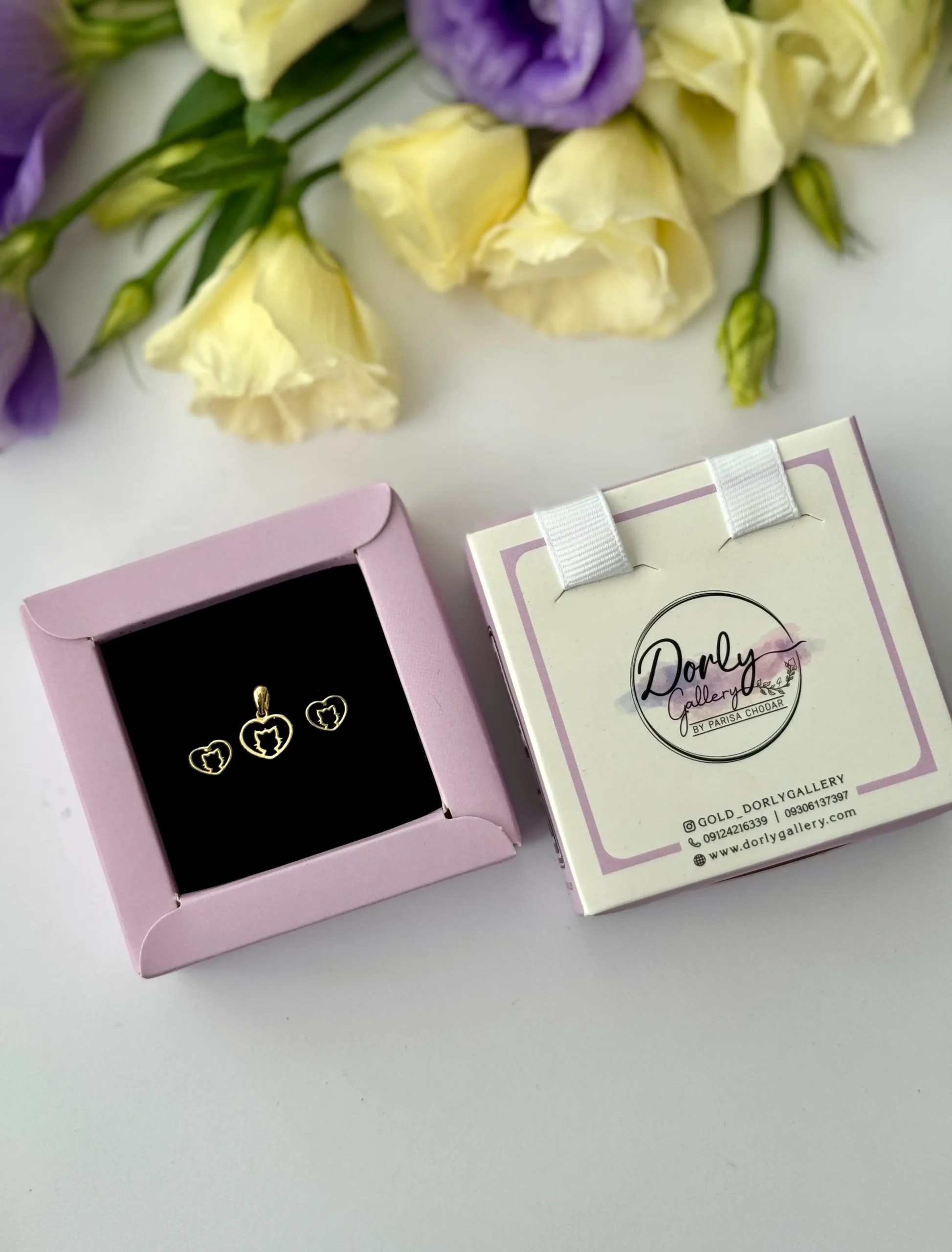 این نیمست جذاب از طلای ۱۸ عیار ساخته شده و شامل یک جفت گوشواره میخی و یک پلاک است. طراحی آن به صورت خطی و مینیمال انجام شده؛ پلاک به شکل قلب توخالی است و درون آن یک گربه خطی به زیبایی جای گرفته است.