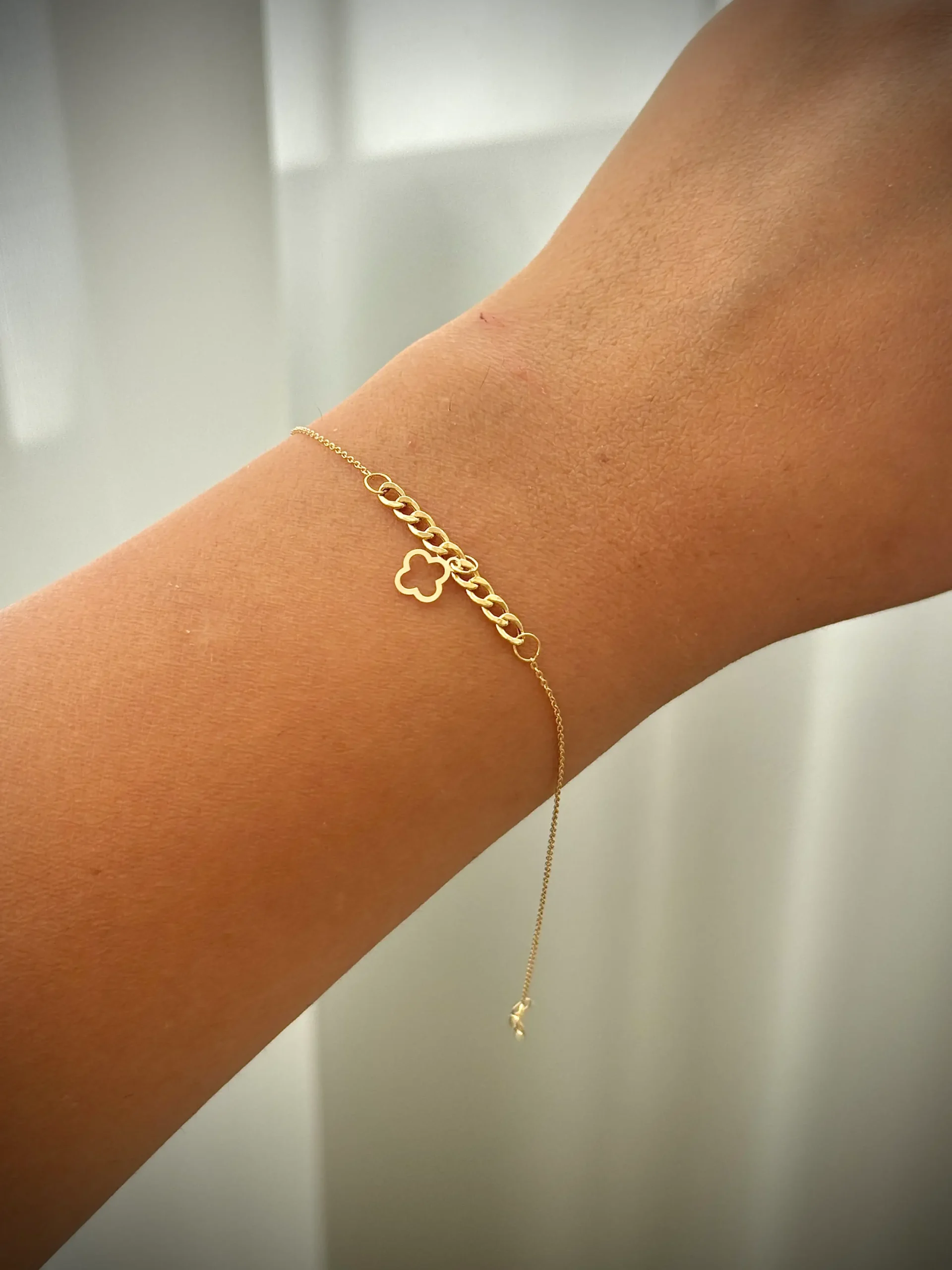 این دستبند ظریف و شیک از طلای ۱۸ عیار ساخته شده و ترکیبی زیبا از زنجیر کارتیر کلاسیک و آویز ونکلیف خطی و توخالی را در خود دارد.