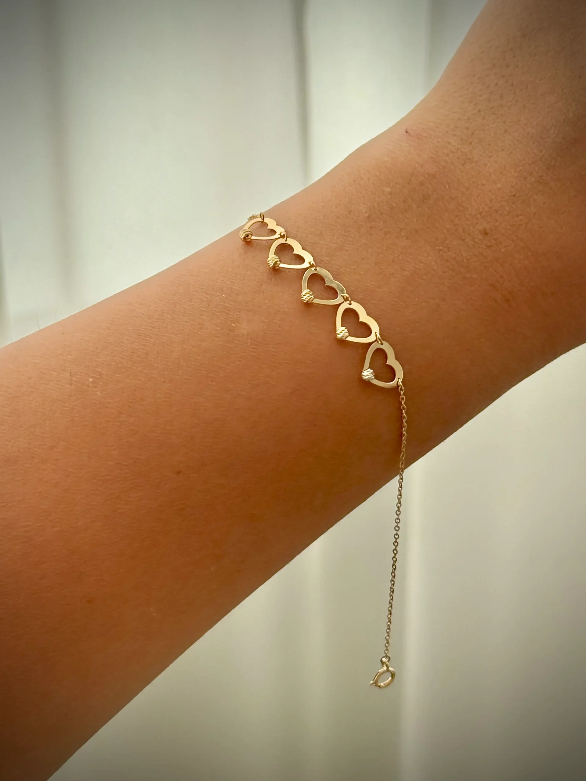 این دستبند ظریف و خاص از طلای ۱۸ عیار ساخته شده و ترکیبی چشمنواز از طراحی مدرن و عاشقانه دارد. در مرکز زنجیر، پنج قلب توخالی و خطی بهصورت هماهنگ در کنار یکدیگر چیده شدهاند و جلوهای مینیمال و ظریف به دستبند دادهاند.