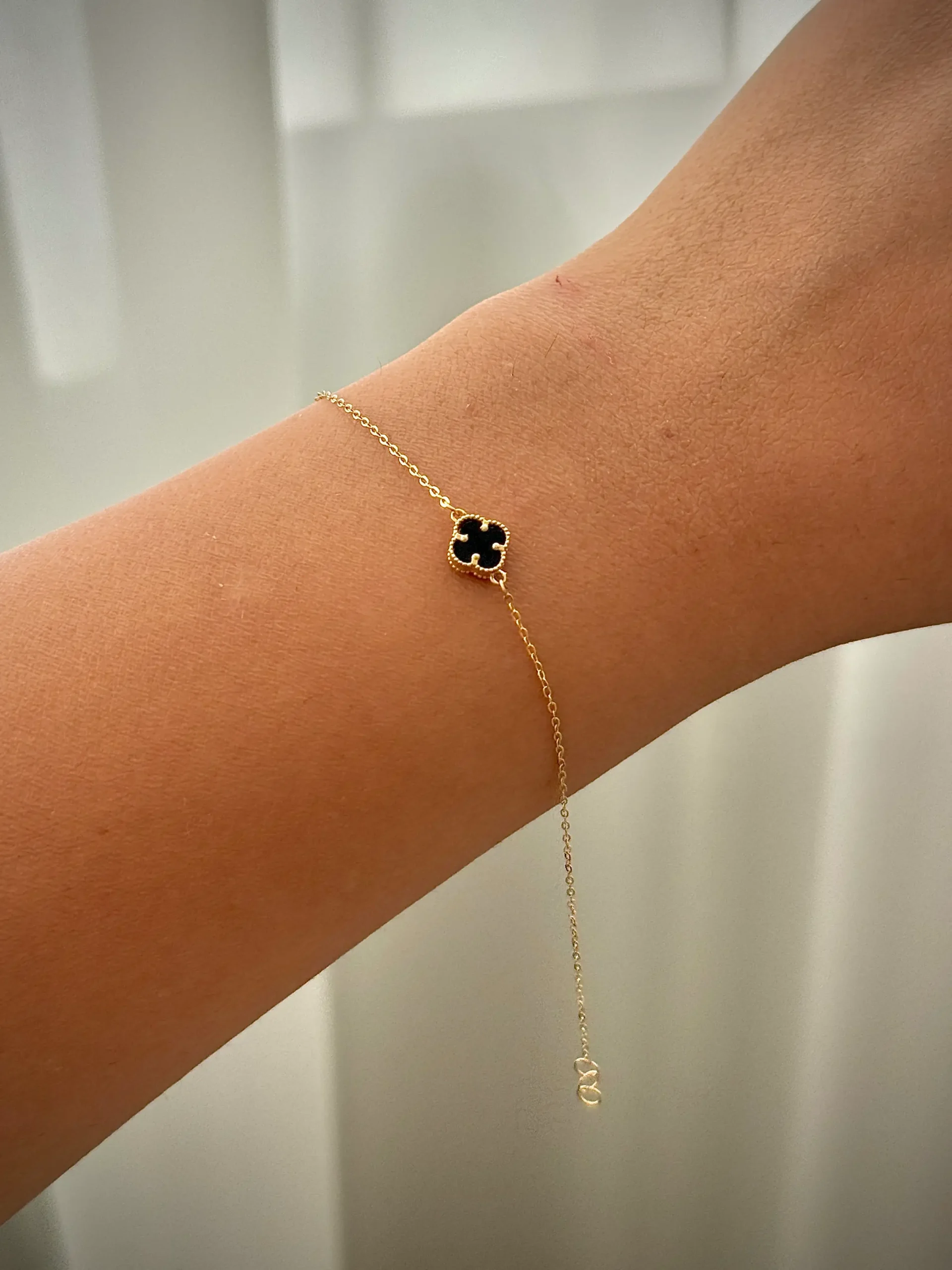 این دستبند ظریف و شیک از طلای ۱۸ عیار ساخته شده و طراحی آن ترکیبی از سادگی و ظرافت است. در مرکز زنجیر، یک گل چهارپر ونکلیف با سنگ مشکی براق قرار دارد که جلوهای چشمگیر و کلاسیک به دستبند میدهد.