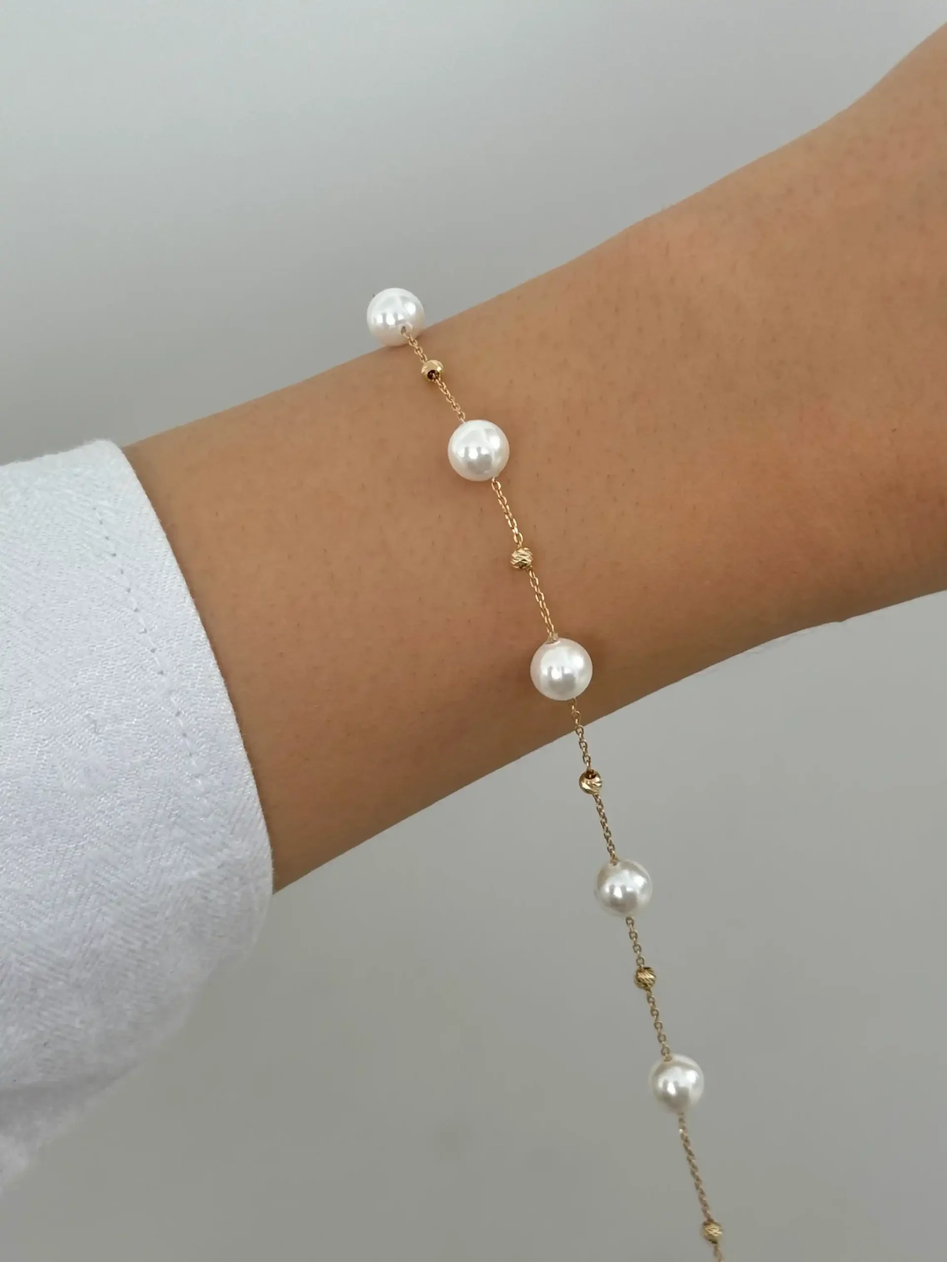 این دستبند زنجیری طلا با ترکیب هنرمندانهی مرواریدهای ظریف و گویهای طلایی تراشدار البرنادو، جلوهای از لطافت، ظرافت و شکوه کلاسیک را به نمایش میگذارد. در ساختار اصلی این مدل، پنج مروارید با سطحی درخشان و رنگ ملایم سفید با فواصل منظم و متناسب روی زنجیر طلای ۱۸ عیار قرار گرفتهاند. این مرواریدها نماد خلوص، وقار و زنانگیاند و حس لطیف و کلاسیکی به طراحی میبخشند.